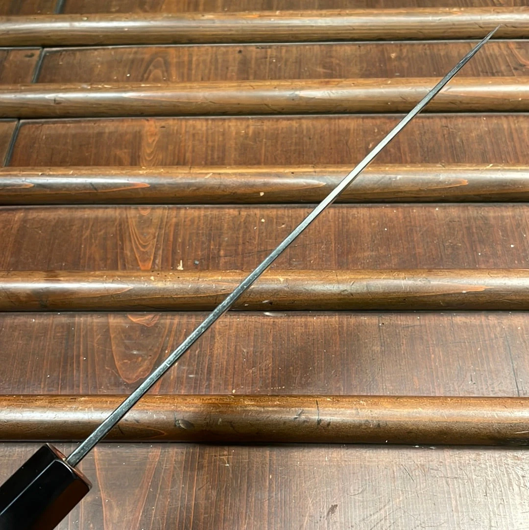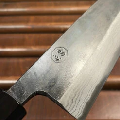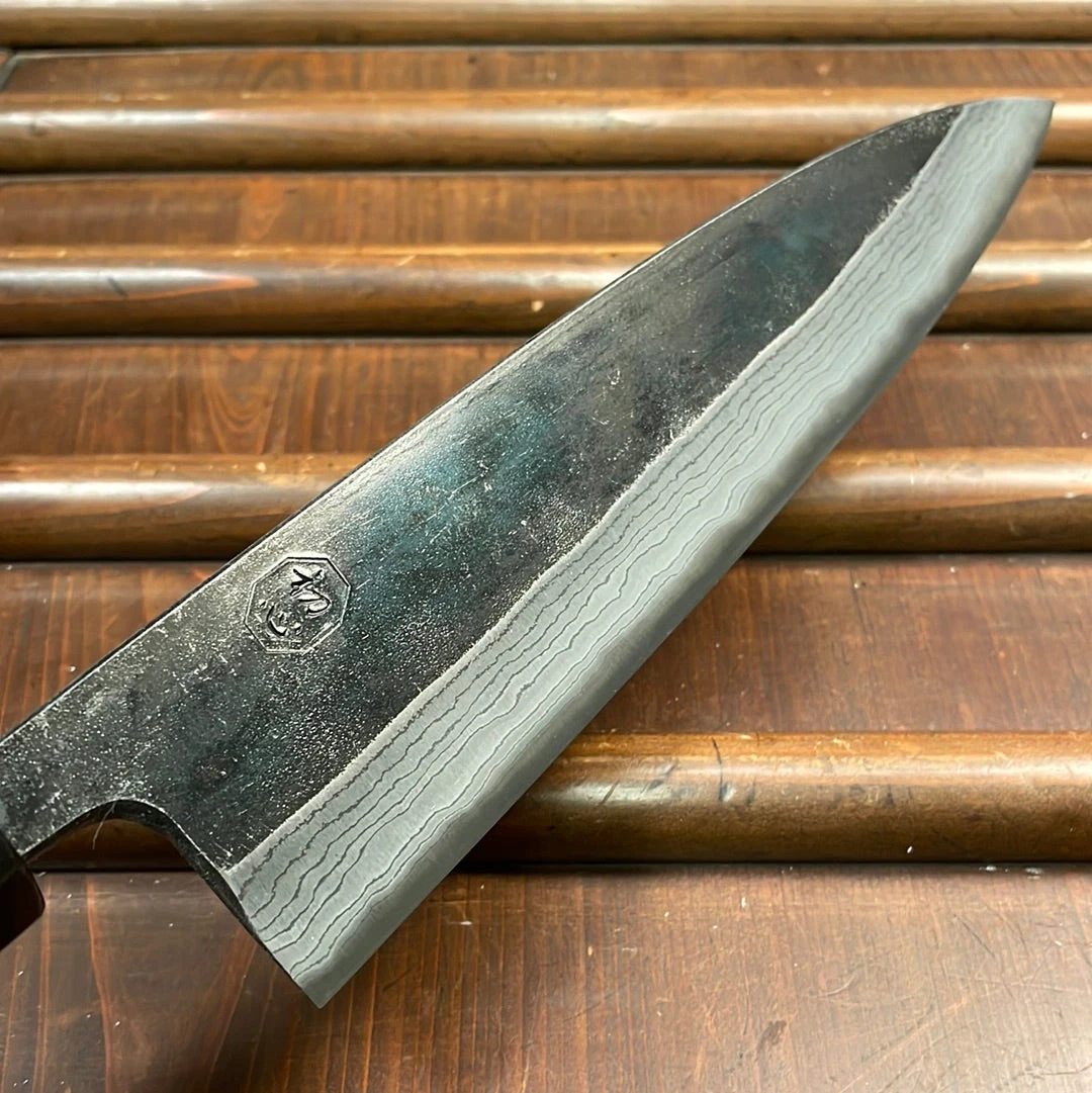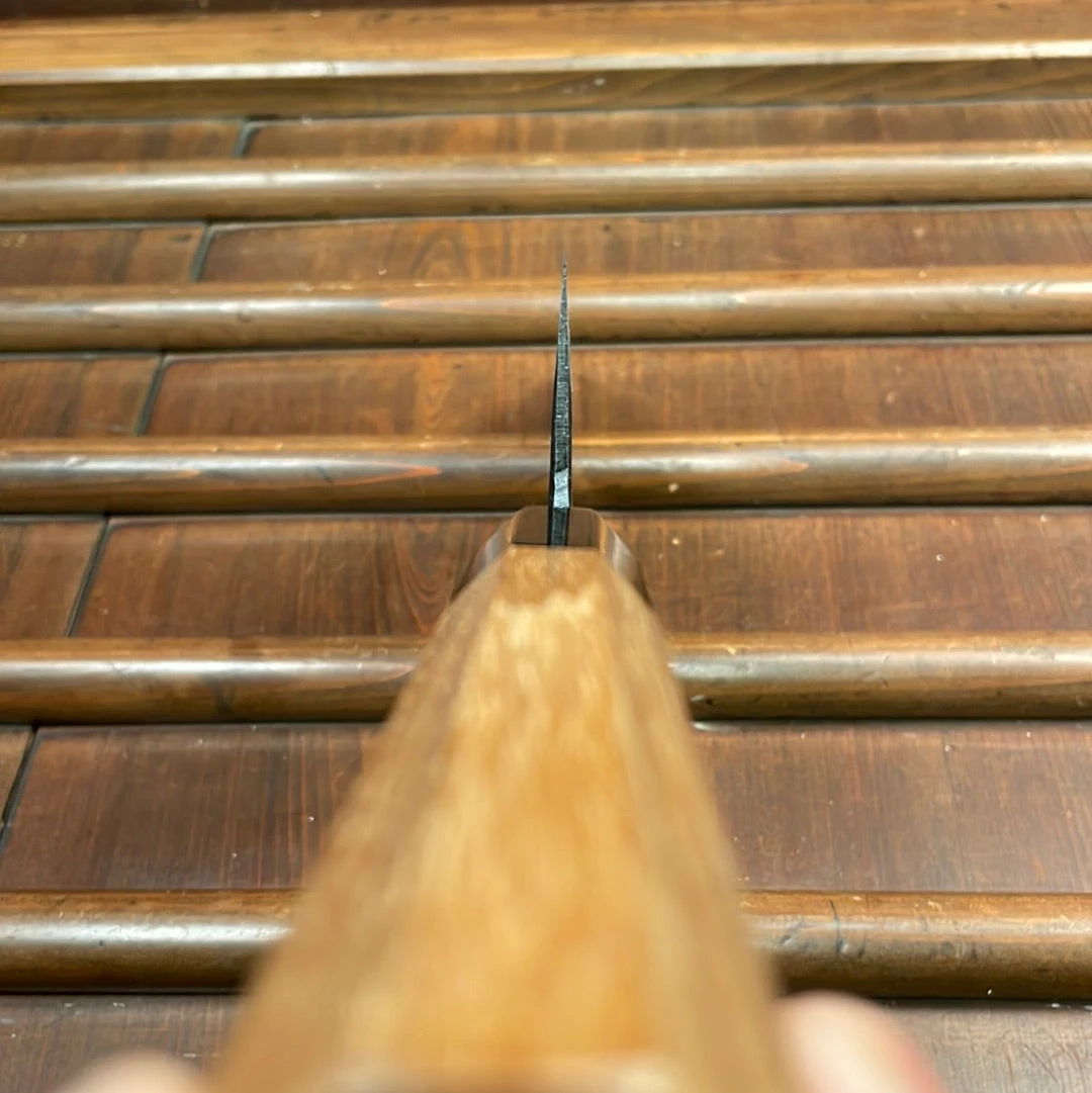 Hand forged in Tosa, these rustic finished mild steel and iron damascus clad aogami 2 knives have a solid middle to heavy weight feel yet are thin behind the edge. Corners of the spine and heel are eased, making for a more comfortable pinch grip with a horn and teak handle for a solid, secure feel.
