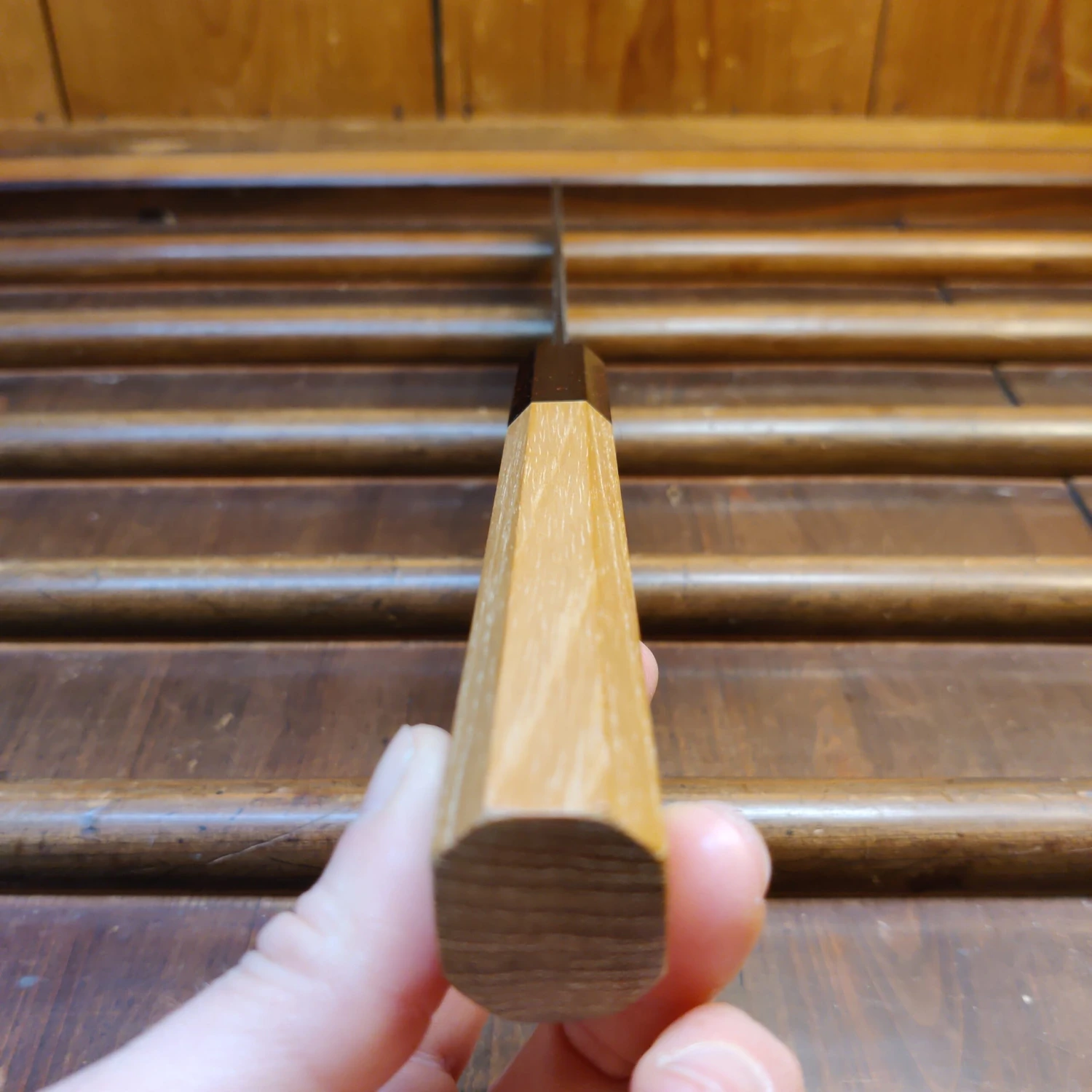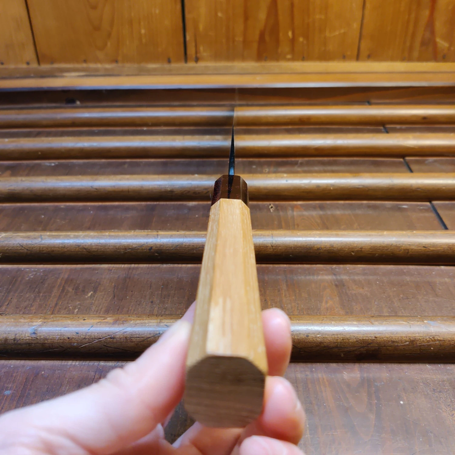 Hand forged in Tosa, these rustic finished mild steel and iron damascus clad aogami 2 knives have a solid middle to heavy weight feel yet are thin behind the edge. Corners of the spine and heel are eased, making for a more comfortable pinch grip with a horn and teak handle for a solid, secure feel.