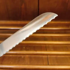 Japanese AUS8A stainless steel blade with pakkawood composite handle. Thin Japanese stainless steel takes and holds a keen edge, these make a great bread, pastry or roast slicer. Made in Seki Japan.