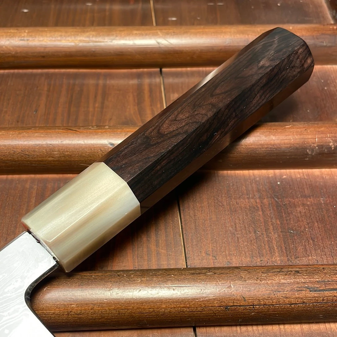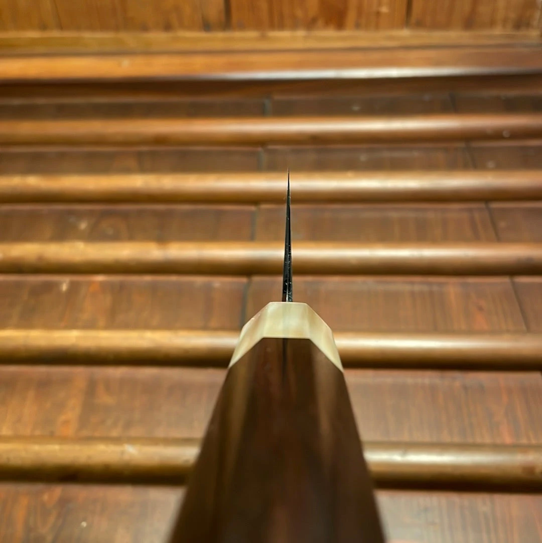 Nakagawa-san’s knives are characterized by excellent heat control during forging and a very thorough heat treatment creating knives that have superb edge formation and edge life with good toughness. His carbon steels are usually easy to sharpen across most steel types. Nakagawa-san reputation as one of a few blacksmiths in Sakai to forge Ginsanko and VG10 stainless steels that results in excellent edge life and toughness is well earned.