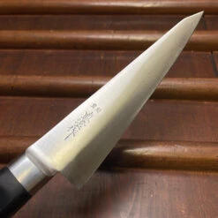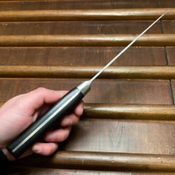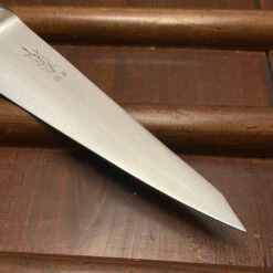New production classic old style Japanese double bevel knife with a monosteel SK tool steel blade and riveted pakka wood western style handle. Their SK mono-steel blades cut very nicely and are super easy to sharpen and get a nice edge that holds well. They are ideal for the professional or home cook who is looking for a carbon steel workhorse with easy sharpen-ability at a reasonable price.