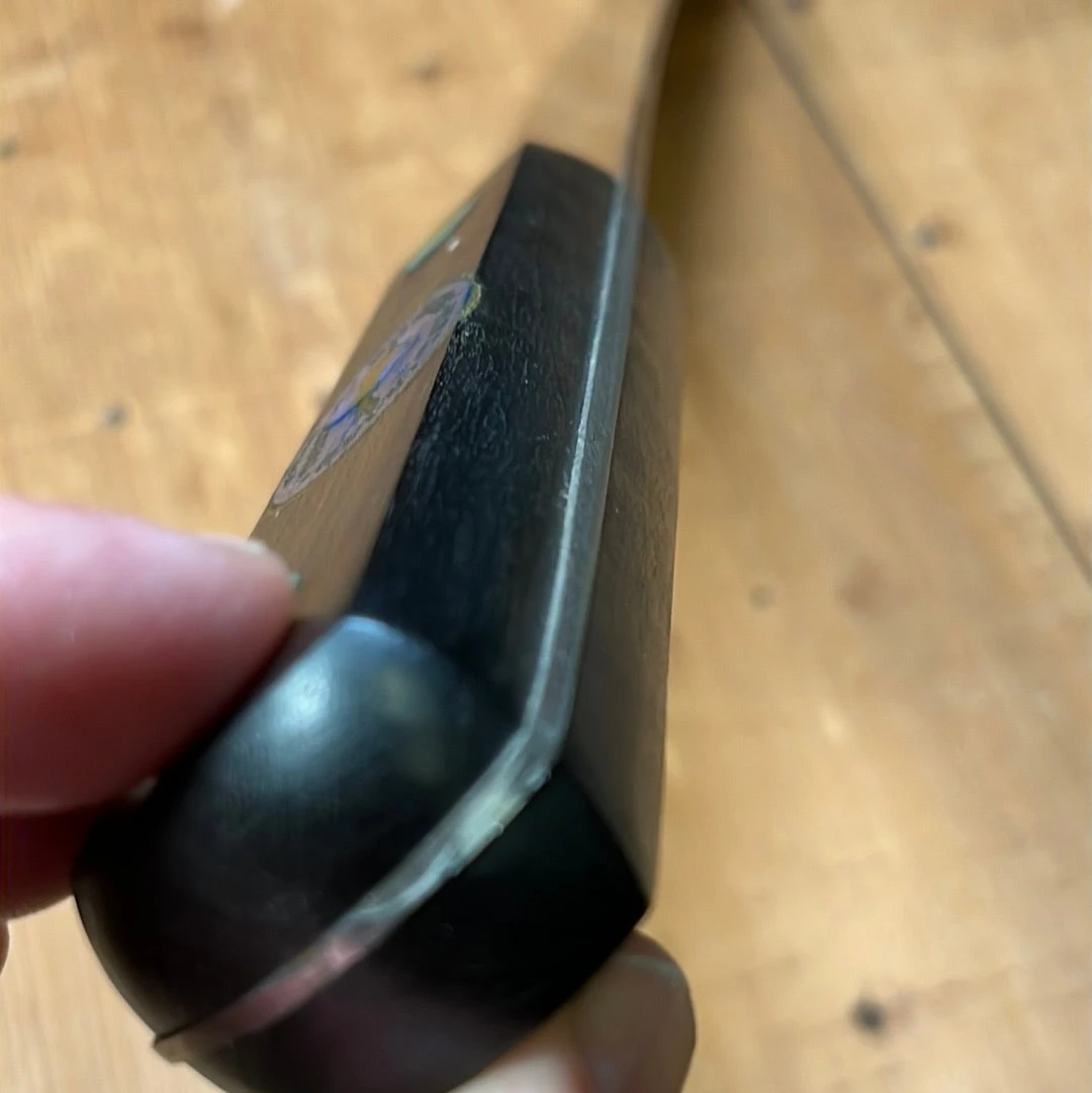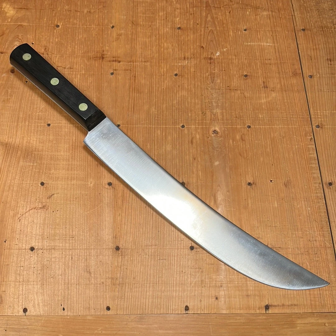 Hand ground blade is in as found condition with original factory edge and fine glazed finish. Dark hard wood handle shows some shrinkage but still has original sticker.