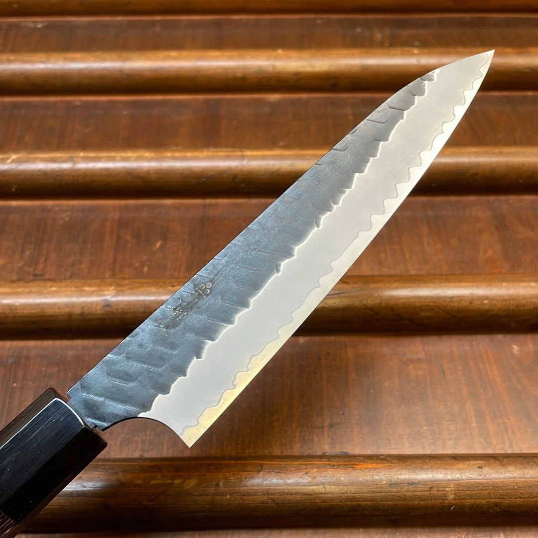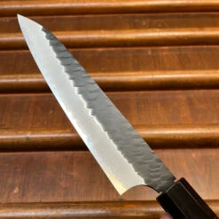 Forged stainless clad SG2 powder metal with hammer marked ‘tsuchime cladding and octagonal wenge handle. SG2 takes a very fine edge easily for a stainless steel of its hardness (63/64) and holds it nicely.