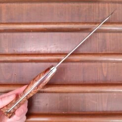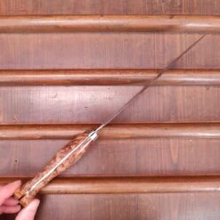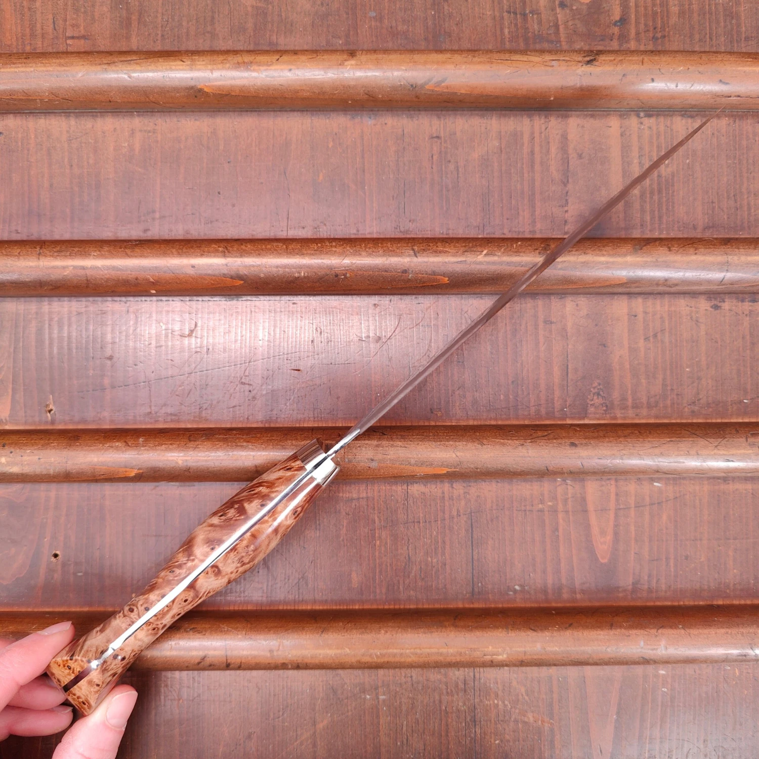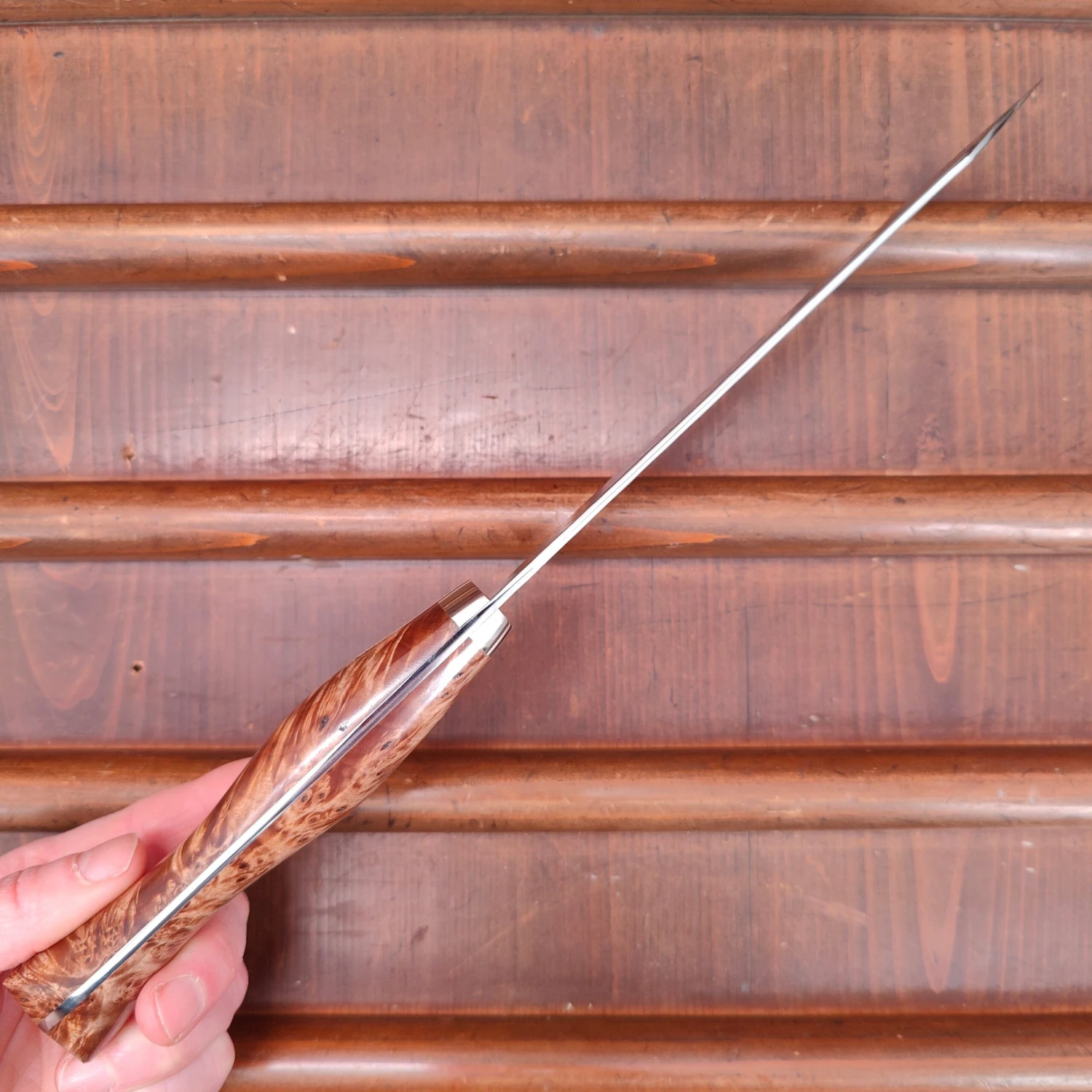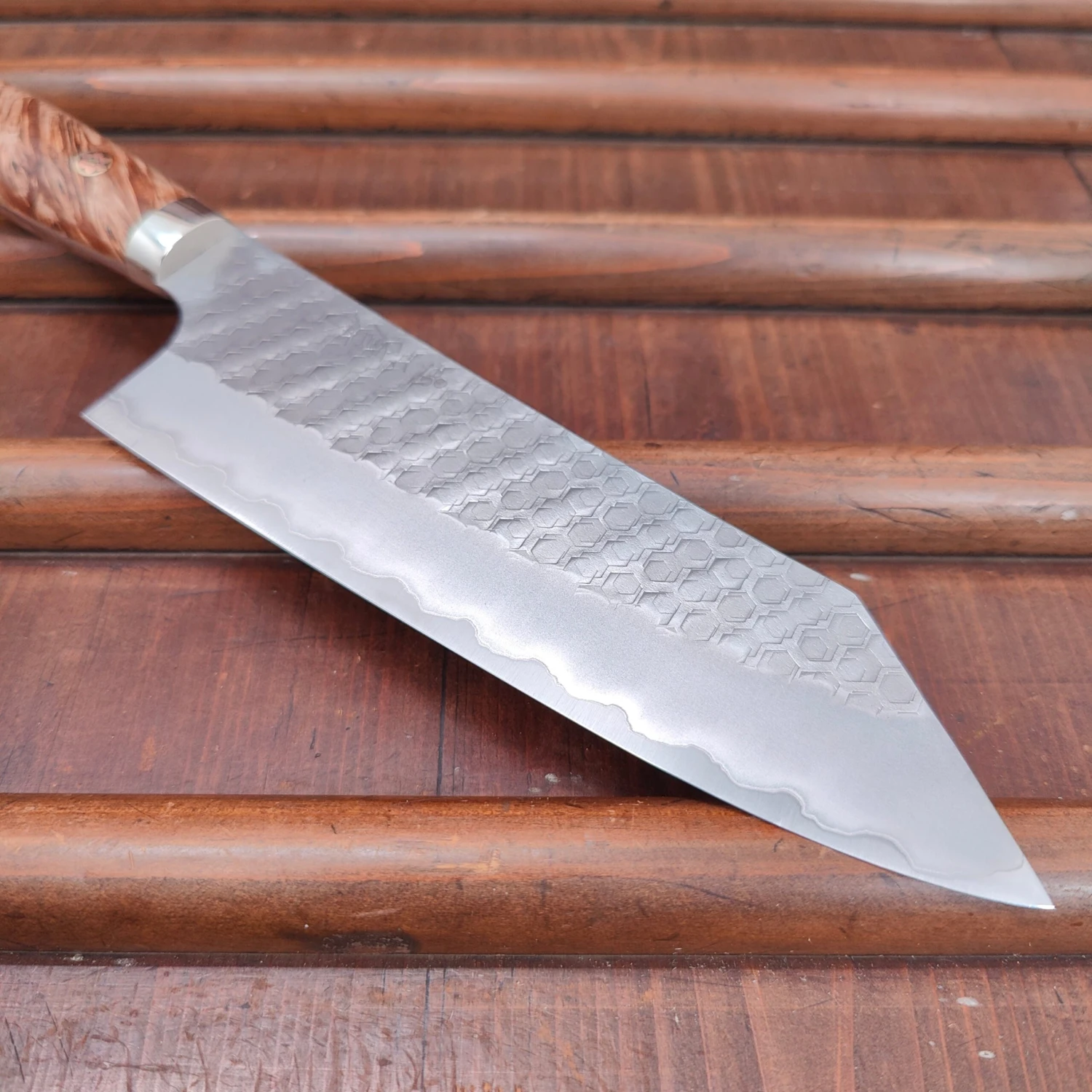 Forged stainless clad SG2 powder metal with migaki finished hammer marked tsuchime cladding and western style stabilized maple burl wood handle. SG2 takes a very fine edge easily for a stainless steel of its hardness (63/64) and holds it nicely.