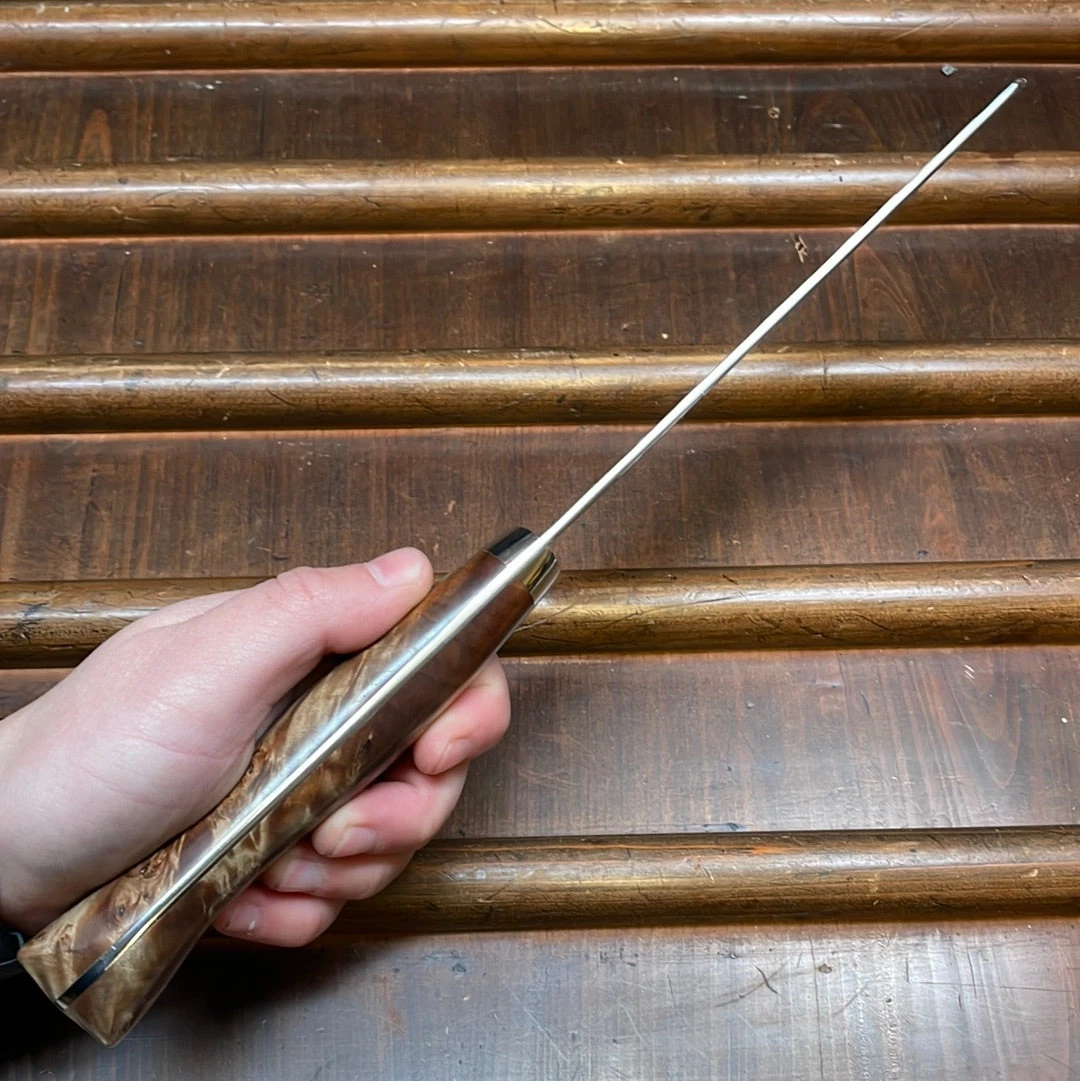 Forged stainless clad SG2 powder metal with kurouchi finished hammer marked tsuchime cladding and western style stabilized maple burl wood handle. SG2 takes a very fine edge easily for a stainless steel of its hardness (63/64) and holds it nicely.