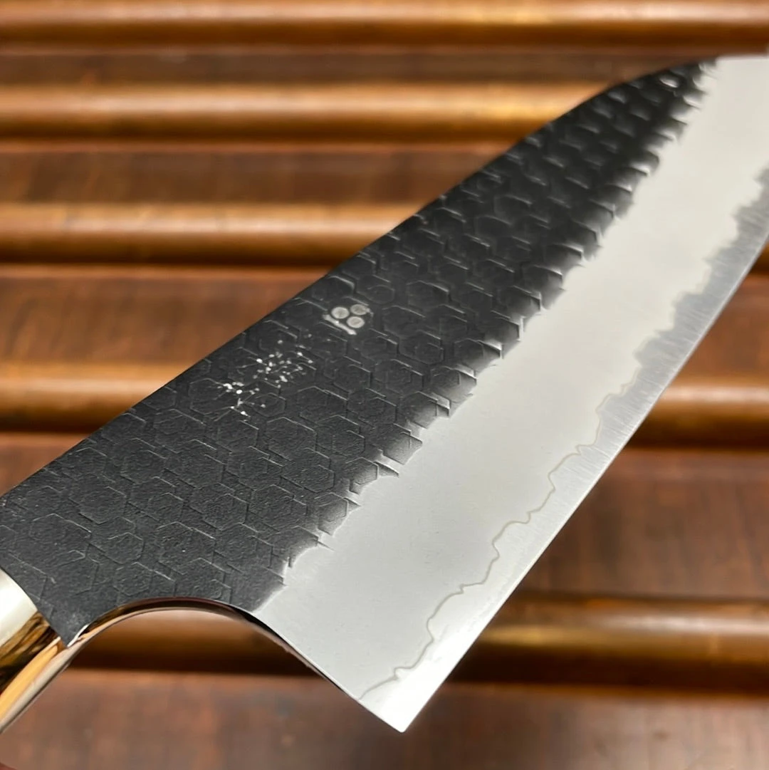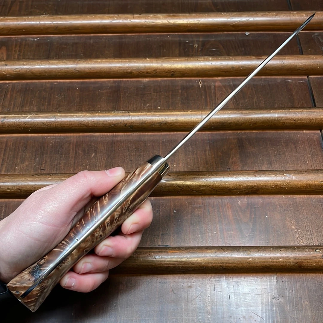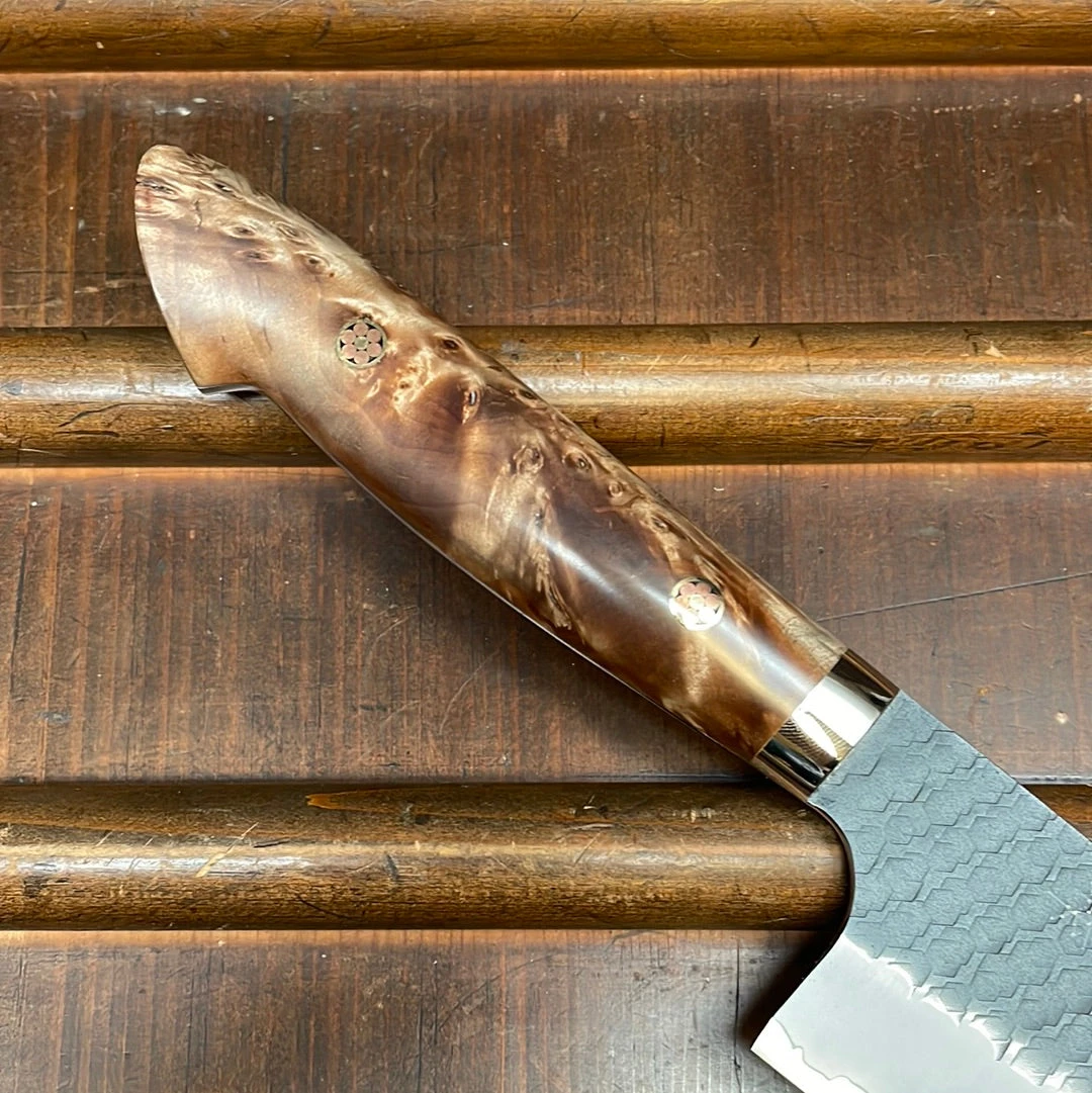 Forged stainless clad SG2 powder metal with kurouchi finished hammer marked tsuchime cladding and western style stabilized maple burl wood handle. SG2 takes a very fine edge easily for a stainless steel of its hardness (63/64) and holds it nicely.