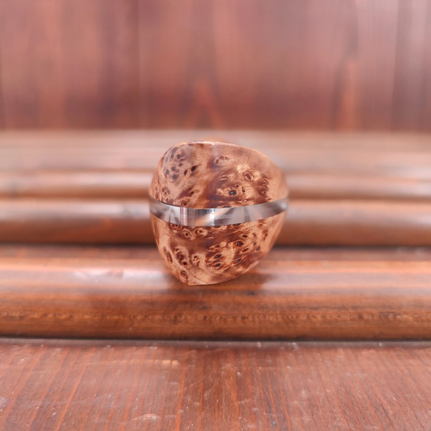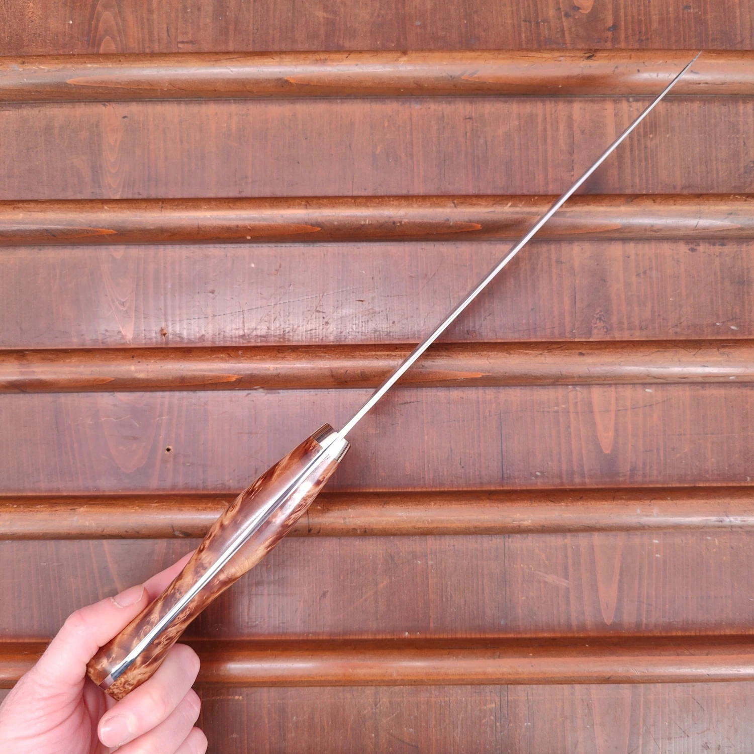 Forged stainless clad SG2 powder metal with damascus finished hammer and western style stabilized maple burl wood handle. SG2 takes a very fine edge easily for a stainless steel of its hardness (63/64) and holds it nicely.