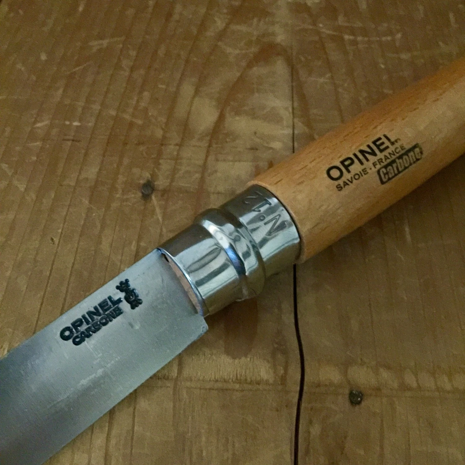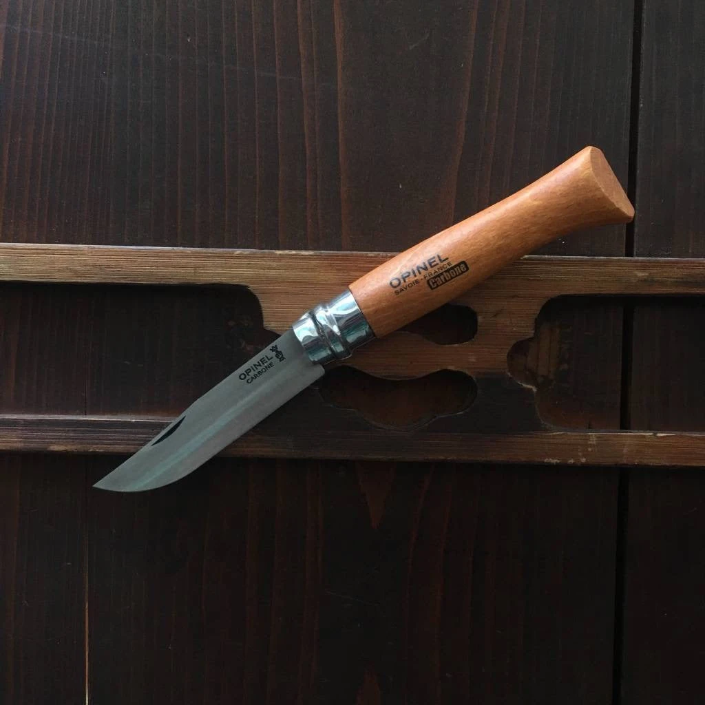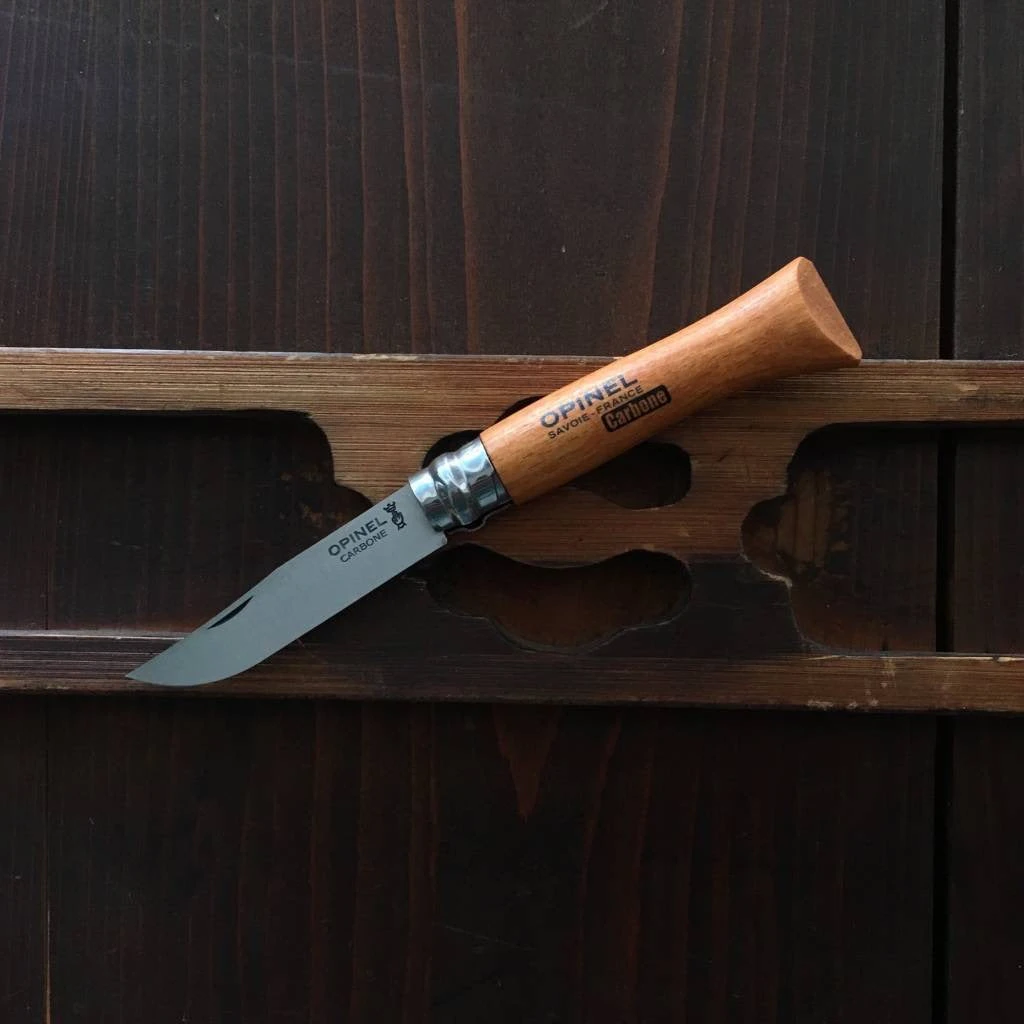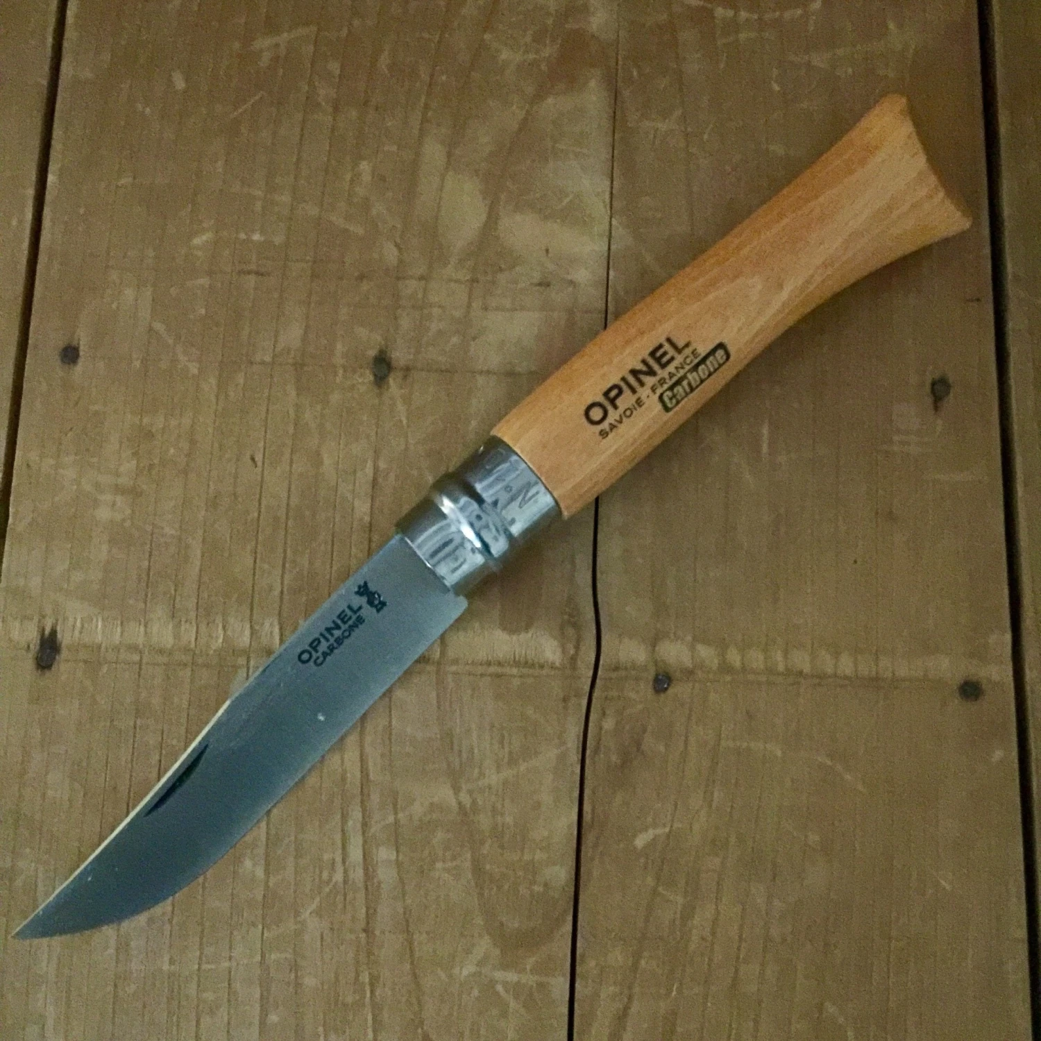 Opinel folding knives. Carbon steel blades. Varnished Beech wood handles.
