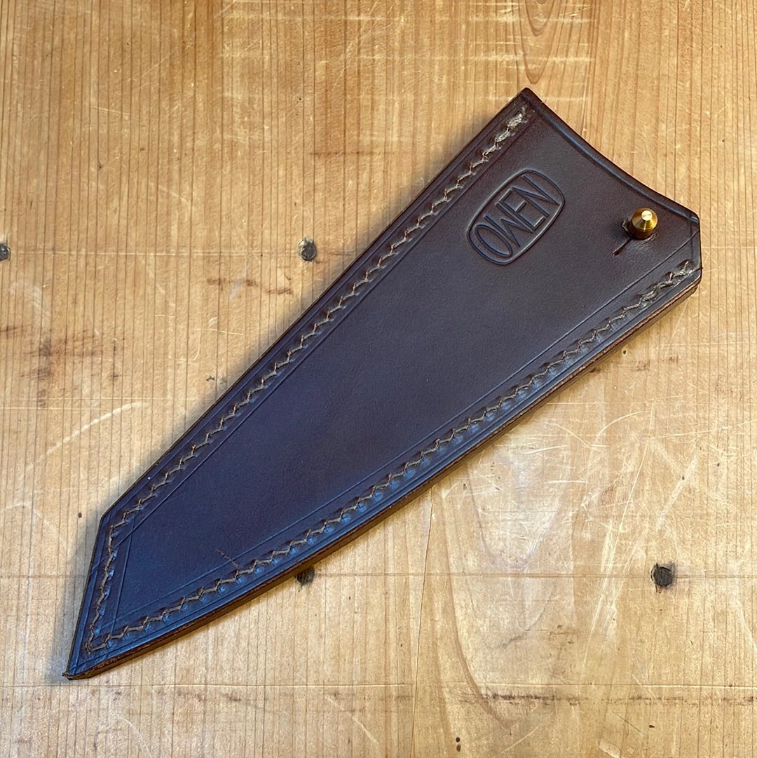 Mid brown Italian vegetable finished leather sheath for Blenheim Forge Classic Range Petty handcrafted by Harry Owen of Owen Leather in Peckham London.