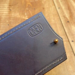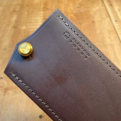 Mid brown Italian vegetable tanned leather sheath for Blenheim Forge Classic Range Nakiri handcrafted by Harry Owen of Owen Leather in Peckham London.