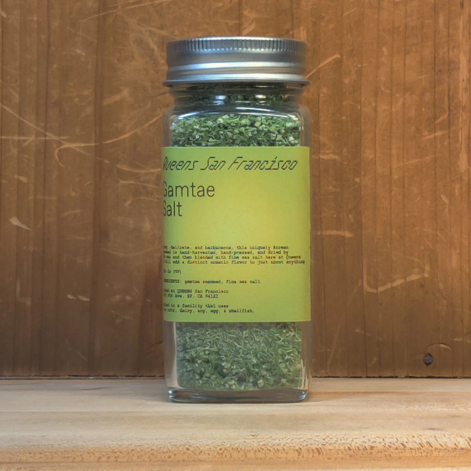 Lacey, delicate, and herbaceous, this uniquely KOREAN SEAWEED is hand-harvested, hand-pressed, and dried by the sea and then blended with fine sea salt here at Queens. It will add a distinct oceanic flavor to just about anything—rice, popcorn, fish—the possibilities are endless.