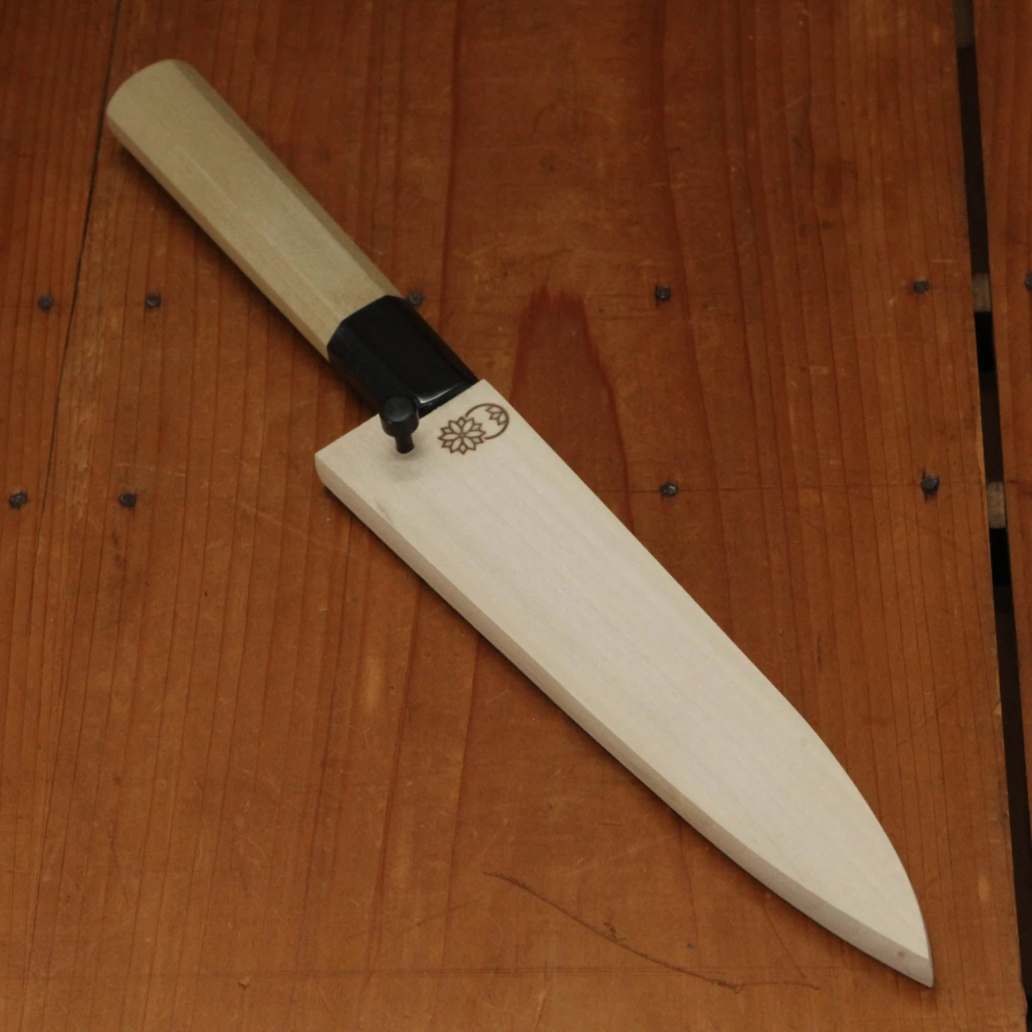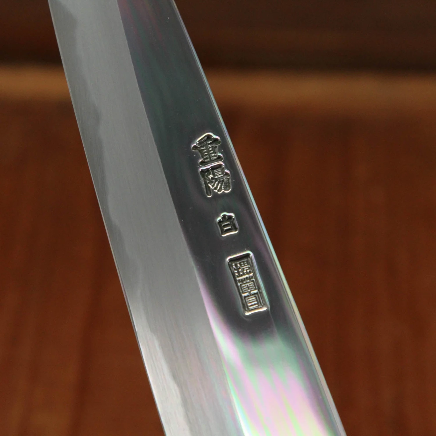 Sakai Kikumori ‘Choyo’ 150mm Kiritsuke Petty. Double bevel shirogami #2 core with mirror polish iron cladding. Octagonal magnolia wood and water buffalo ferrule handle. Comes with saya.