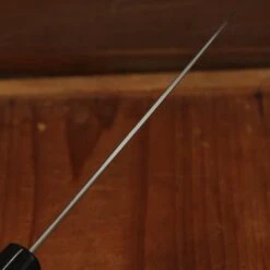 Choyo grinder and polisher is Morihiro Hamono. Morihiro-san’s grinding is superb; he pioneered this low kiriba grind on wa-gyuto. The characteristic result of this grinding and polishing are the even, wide bevels, chamfered spine and brilliant mirror polish.