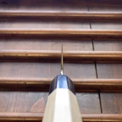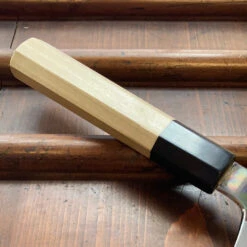 Choyo grinder and polisher is Morihiro Hamono. Morihiro-san’s grinding is superb; he pioneered this low kiriba grind on wa-gyuto. The characteristic result of this grinding and polishing are the even, wide bevels, chamfered spine and brilliant mirror polish.