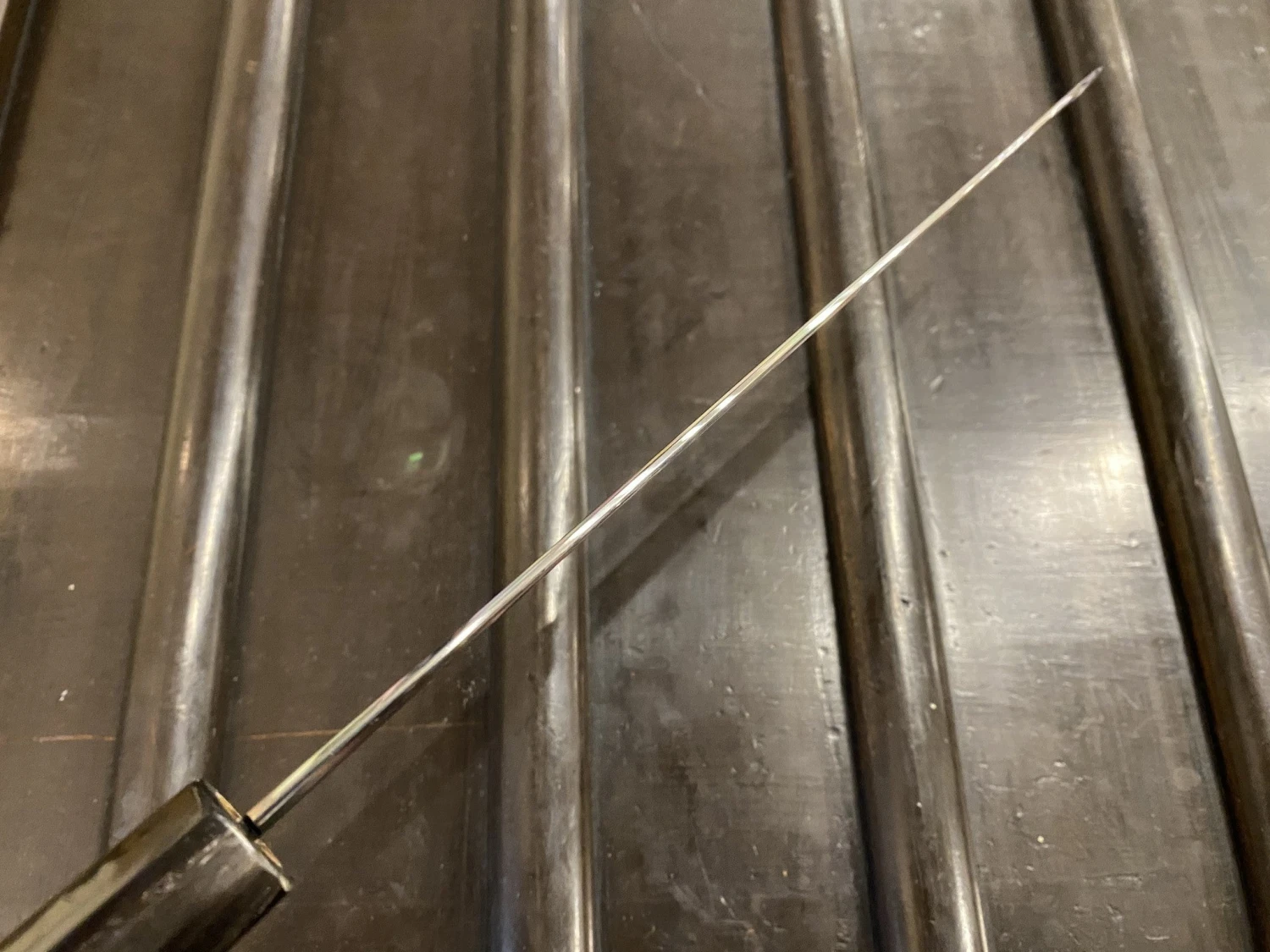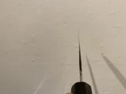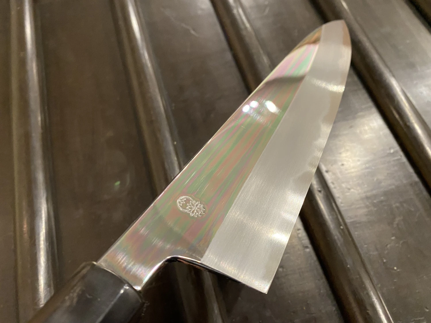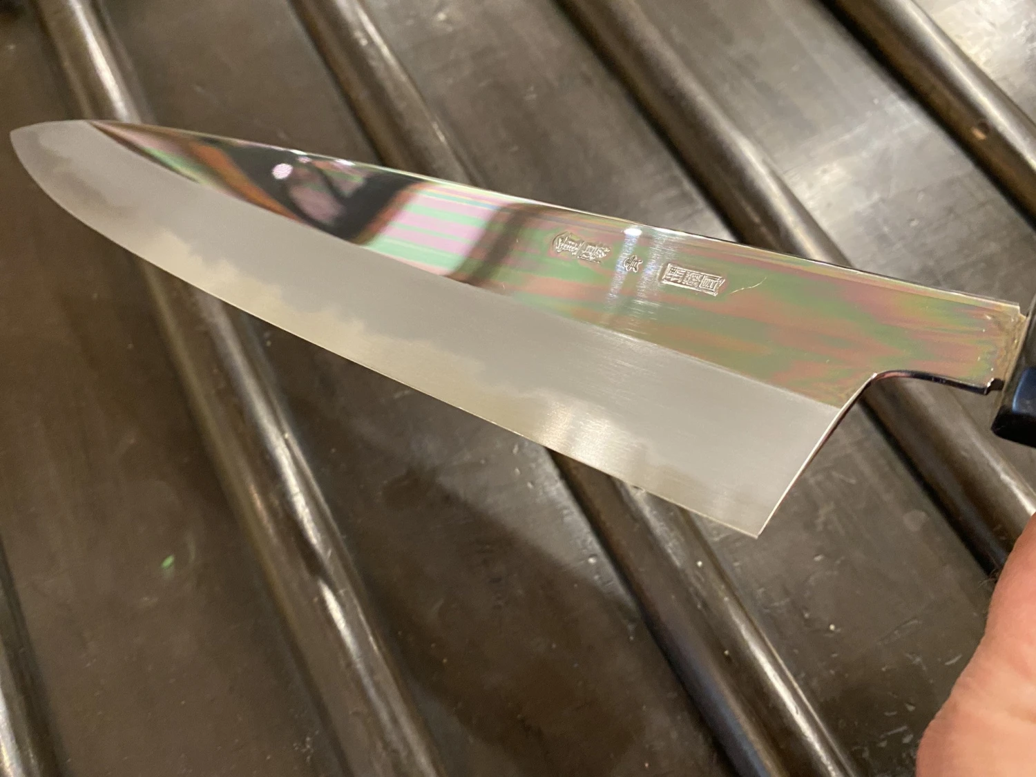 Choyo grinder and polisher is Morihiro Hamono. Morihiro-san’s grinding is superb; he pioneered this type of low kiriba grind on wa-gyuto. The characteristic result of this grinding and polishing are the even, wide bevels, chamfered spine and brilliant mirror polish.
