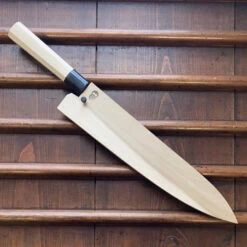 Sakai Kikumori ‘Choyo’ 270mm gyuto. Double bevel aogami #1 core with mirror polish iron cladding. Octagonal magnolia wood and water buffalo ferrule handle. Comes with saya.