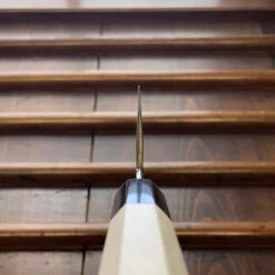 Choyo grinder and polisher is Morihiro Hamono. Morihiro-san’s grinding is superb; he pioneered this type of low kiriba grind on wa-gyuto. The characteristic result of this grinding and polishing are the even, wide bevels, chamfered spine and brilliant mirror polish.