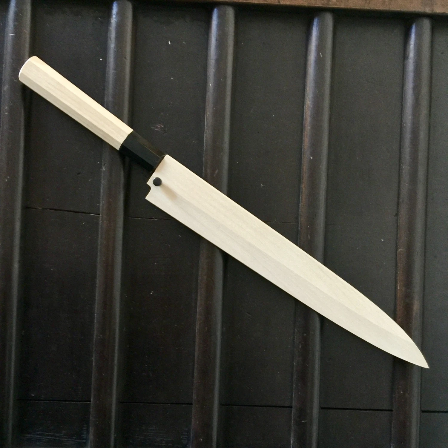 Sakai Kikumori ‘Choyo’ 270mm Yanagi. Single bevel aogami #1 core blade with mirror polish iron cladding. Octagonal magnolia wood and water buffalo ferrule handle. Comes with saya.