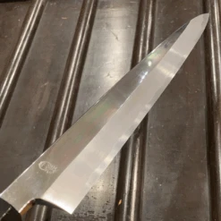 Sakai Kikumori ‘Choyo’ 300mm Yanagi. Single bevel shirogami #2 core with mirror polish iron cladding. Octagonal magnolia wood and water buffalo ferrule handle. Comes with saya.