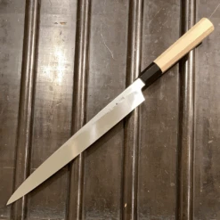 These have a light blade with a thin, low beveled kireba so the yanagis — that usually rely on weight to help propel a pull cut — slice just as easily as heavier ones.