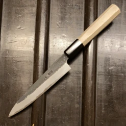 Sakai Kikumori Kikuzuki Kuro’ 150mm Petty. Double bevel shirogami #2 core blade with kurouchi iron cladding. Octagonal magnolia wood and water buffalo ferrule handle.