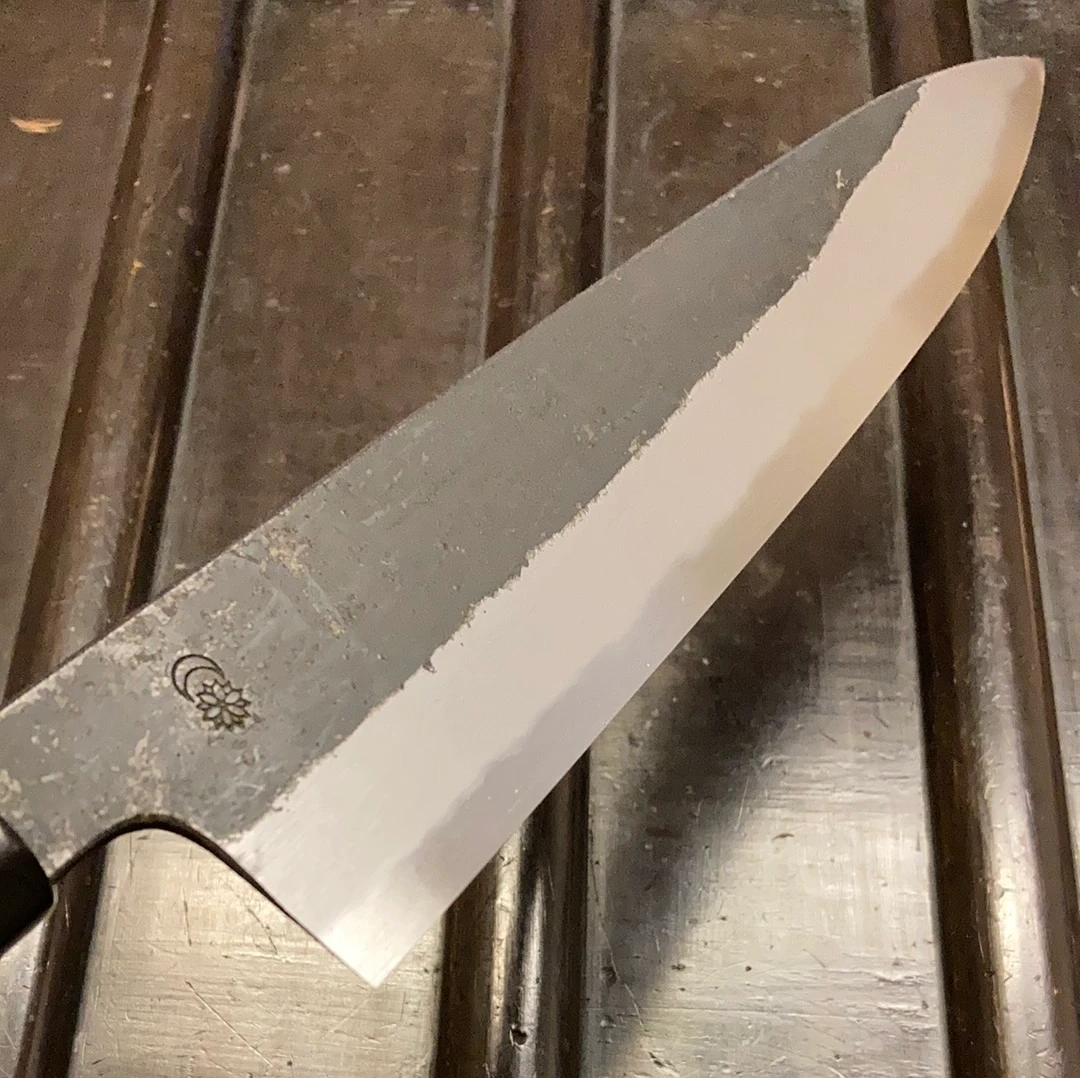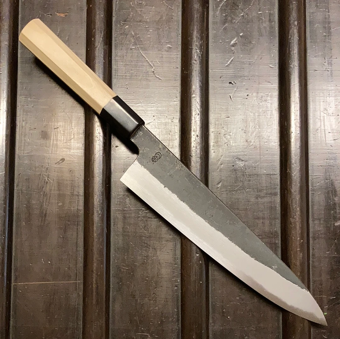 Sakai Kikumori Kikuzuki Kuro’ 240mm Gyuto. Double bevel shirogami #2 core blade with kurouchi iron cladding. Octagonal magnolia wood and water buffalo ferrule handle.