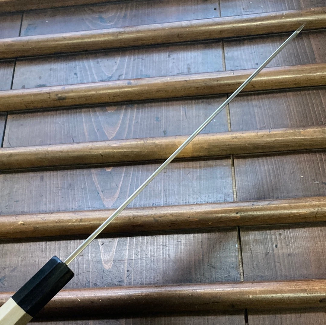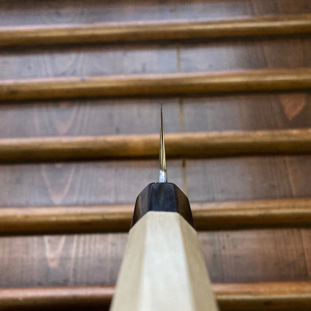 Sakai Kikumori ‘Sori’ 240mm Kiritsuke Sujihiki. Double bevel aogami #1 core blade iron and mild steel suminagashi cladding. Octagon magnolia wood and water buffalo ferrule handle with a sori “bent” or curved spine.