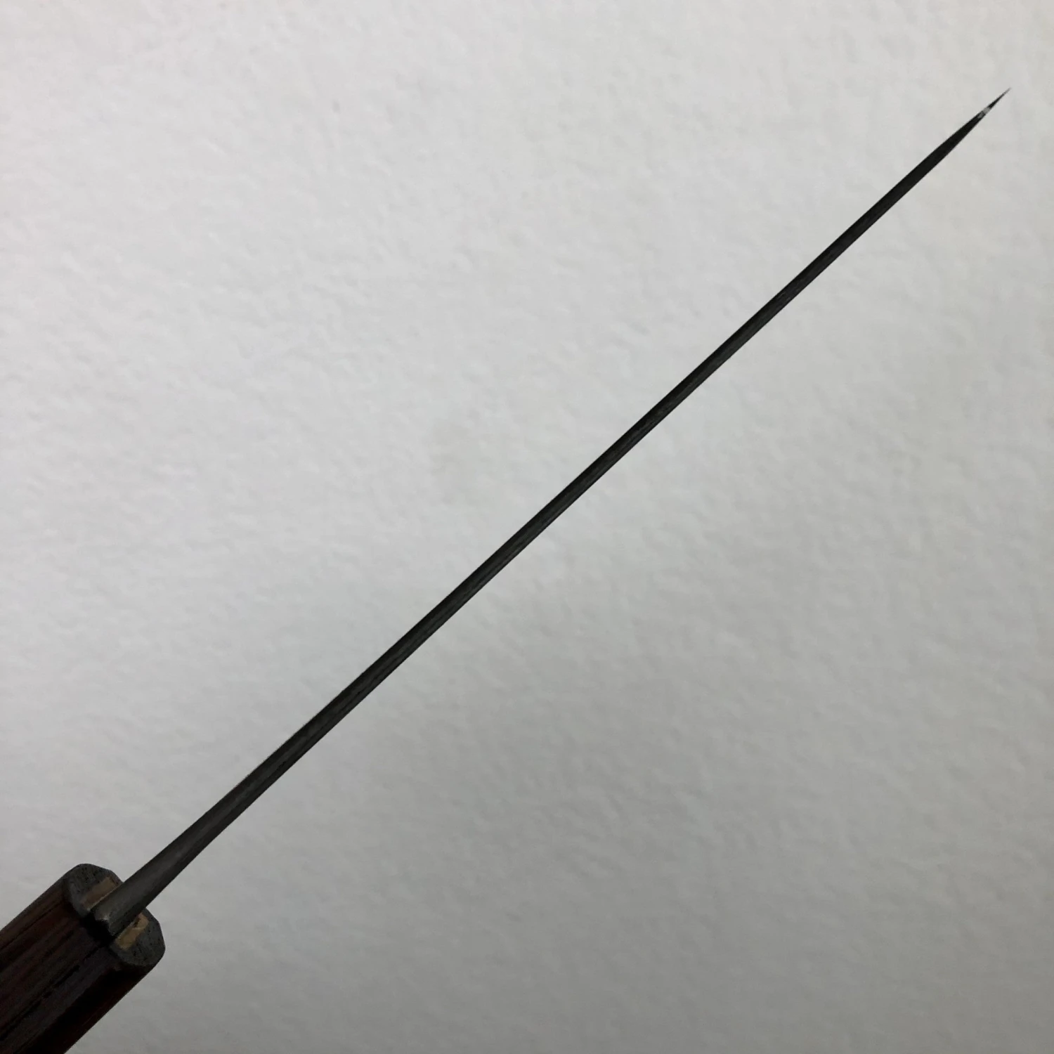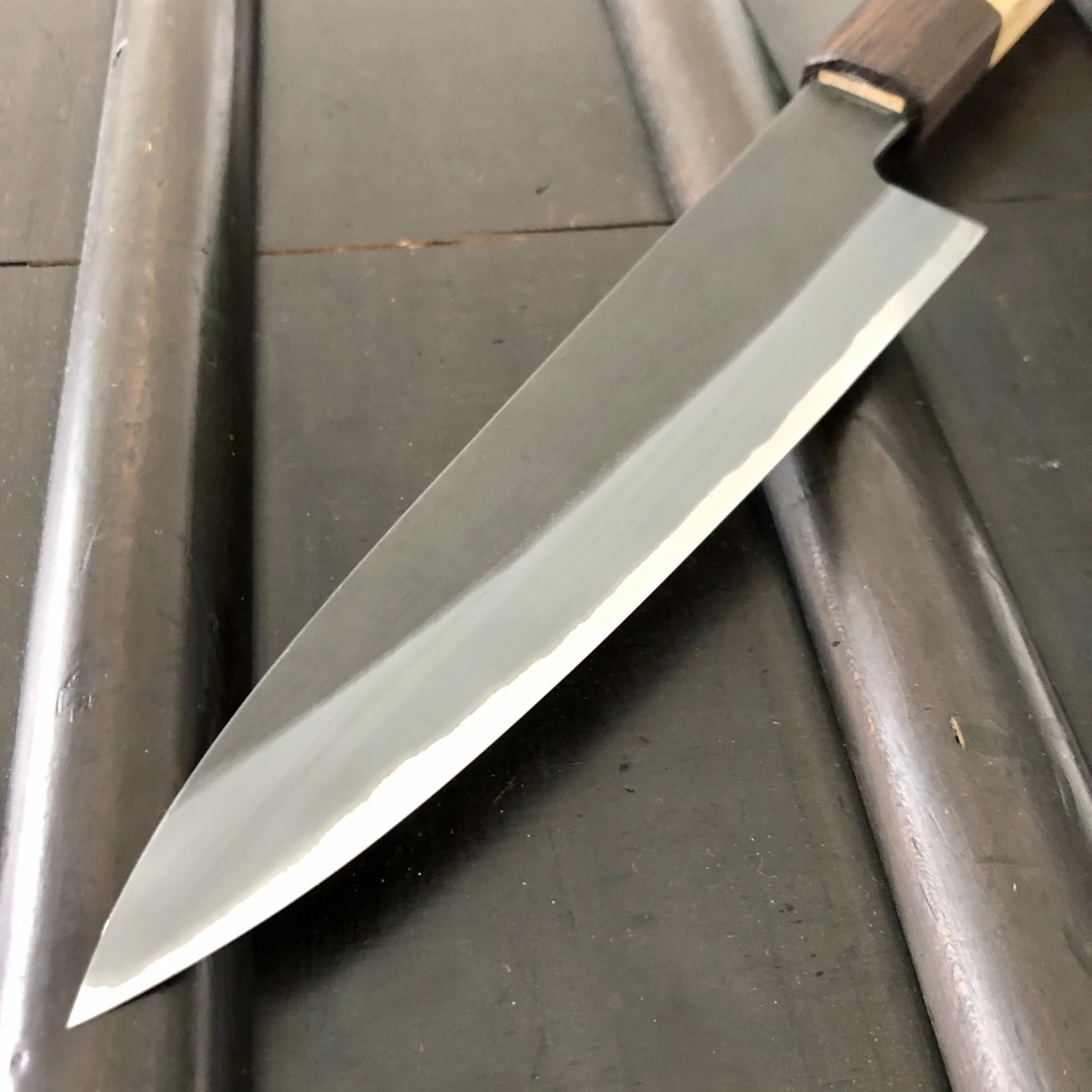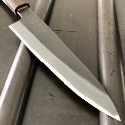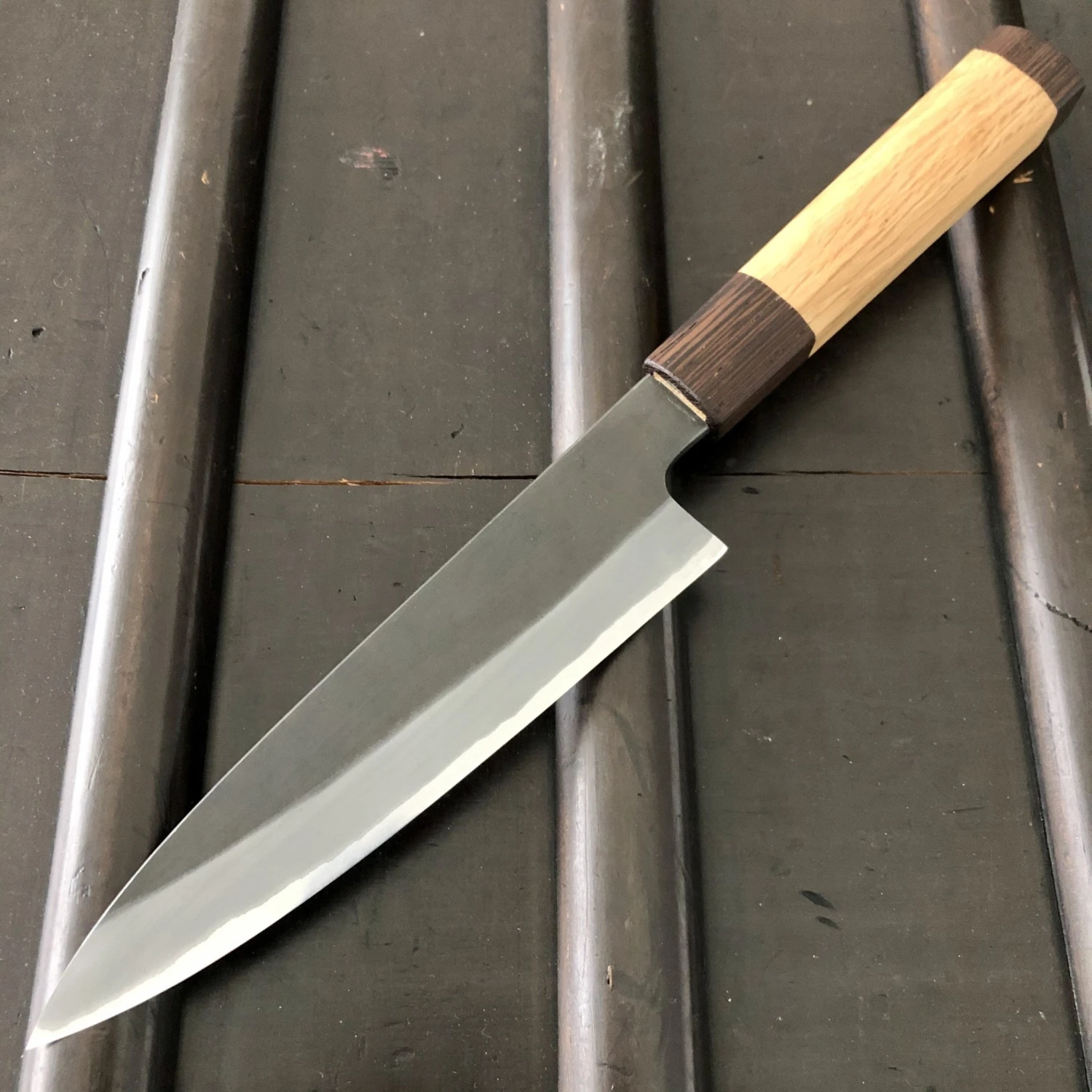 These are forged in stainless clad shirogami 2 with a kurouchi finish, they have the classic Sanjo geometry with strong distal taper and a square leaning oak and wenge octagonal handle, also made in Sanjo specifically for this series.