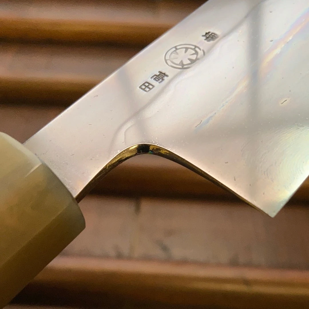 This water quenched aogami honyaki series is handforged at Nakagawa Hamono (formerly Shiraki Hamono) by the super talented blacksmith Nakagawa-san and hand ground with a beautiful finish bringing out the more subtle aogami hamon line by Mitsuaki Takada at the Takada no Hamono workshop.