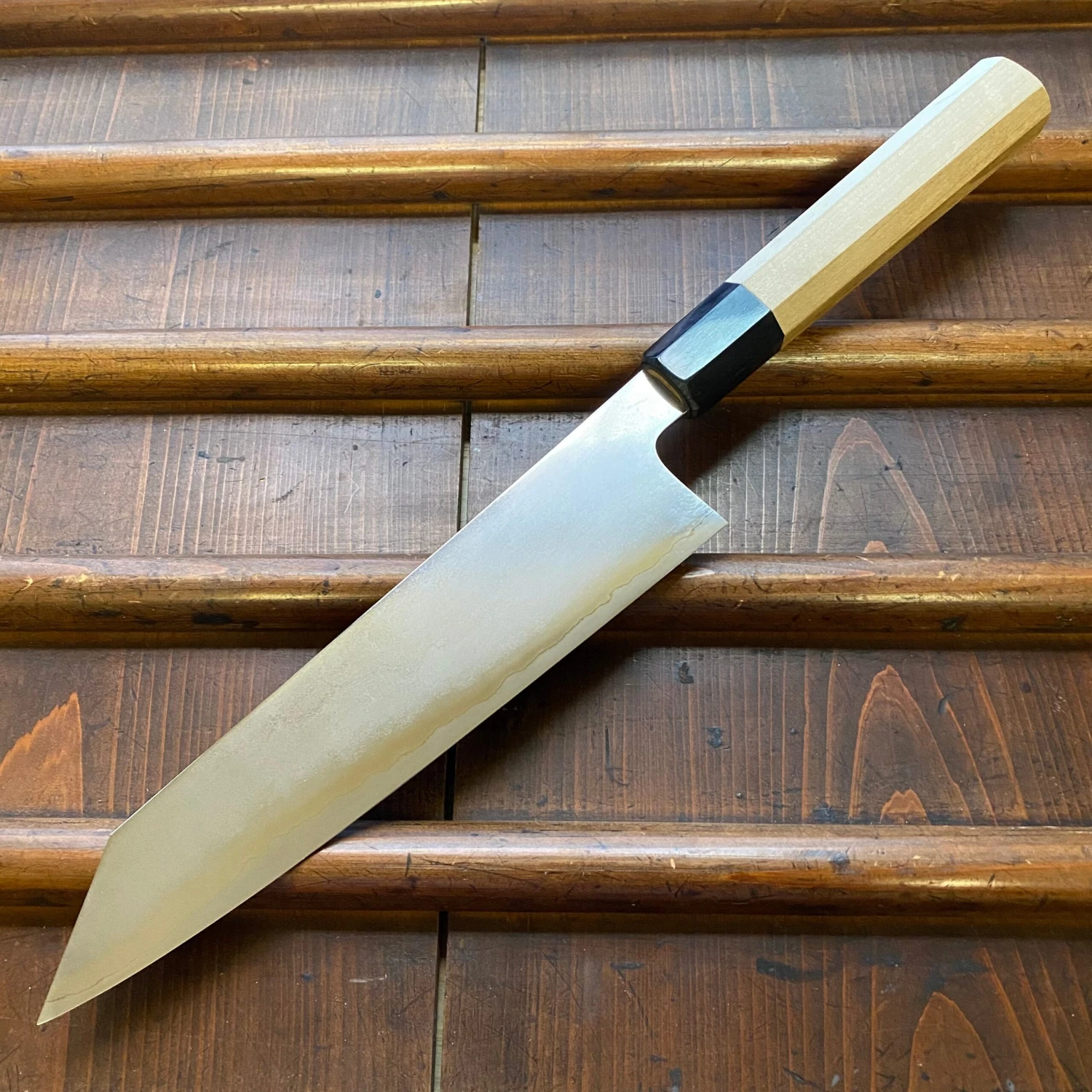 Hand made stainless clad ginsanko stainless steel made in Sakai Osaka Japan, forged at Shiraki Hamono by the super talented young smith Nakagawa-san and hand ground and finish sharpened at the Takada no Hamono workshop. This ginsanko offers excellent edge life and can be finished similar to fine carbon steels like shirogami.