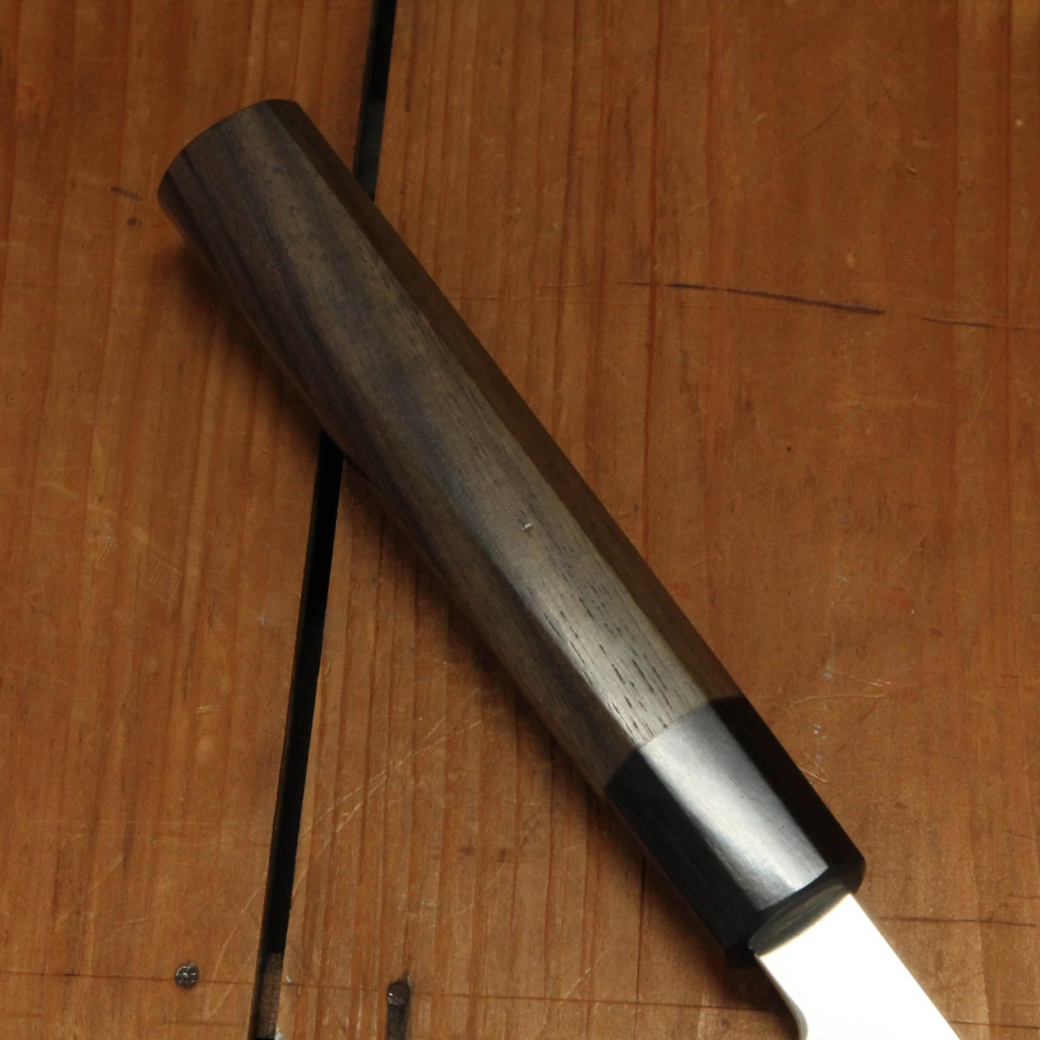 Hand made stainless clad ginsanko stainless steel made in Sakai Osaka Japan, forged at Shiraki Hamono by the super talented young smith Nakagawa-san and hand ground and finish sharpened at the Takada no Hamono workshop. This ginsanko offers excellent edge life and can be finished similar to fine carbon steels like shirogami.