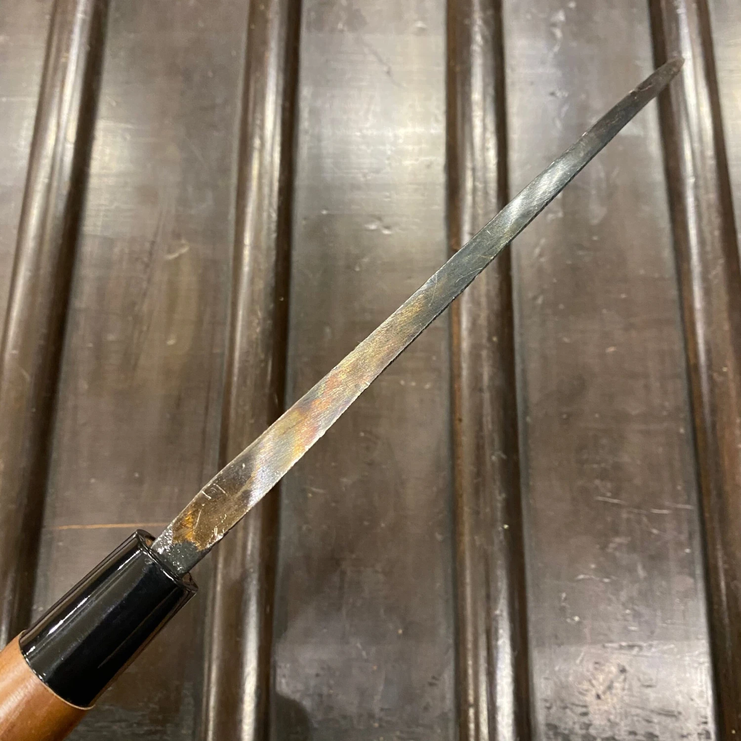 These knives come from the maker with lacquer on the blade for corrosion protection during shipping. It can be removed using acetone or lacquer thinner (follow manufacturers instructions for use).