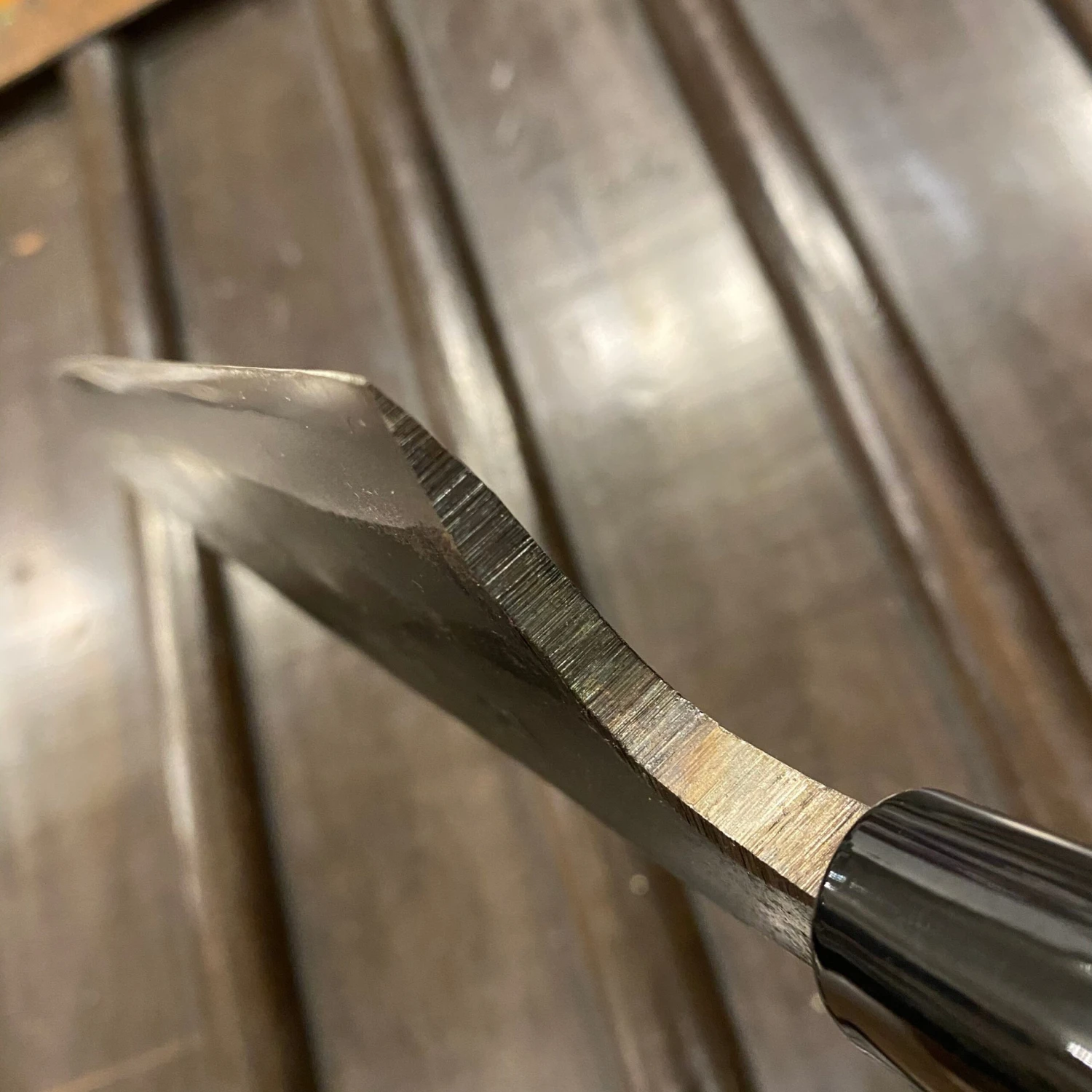 This is a reactive carbon steel. It should be mentioned that extra care is required, as the knife is not stainless and should be dried immediately after use. It will develop a dark patina with usage, but any orange rust should be removed with a light abrasive.