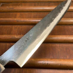 Tosa Tsukasa 210mm Sujihiki. Iron clad shirogami 1 carbon steel blade, ho wood handle with plastic ferrule.