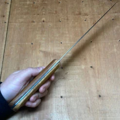 This knife has been re-ground and thinned behind the edge on a large 3 foot diameter Japanese water stone wheel (kaiten mizu toishi) and then resurfaced with a medium fine finish, our take on an old style grinding and finishing technique. While the particular wheel used to refurbish this knife is typically used in Japanese knife making it is very similar to the old grinding wheels used to shape European and American hand ground cutlery. A convex face to a blade greatly increases a knife’s performance as there is less sticking as there is on a flat face and the blade does not get thick behind the edge nearly as fast as with a flat faced blade. Being that we are often working with old blades that need re-shaping and might have been rusted expect some minor imperfections, we try to give a fresh start to our re-ground blades with an eye towards their original grind style and keeping as much metal is needed on a blade when ever possible. Check out Bernal Cutlery co founder Josh Donald’s book Sharp to see these wheels in use and more about their history in Europe and Japan.