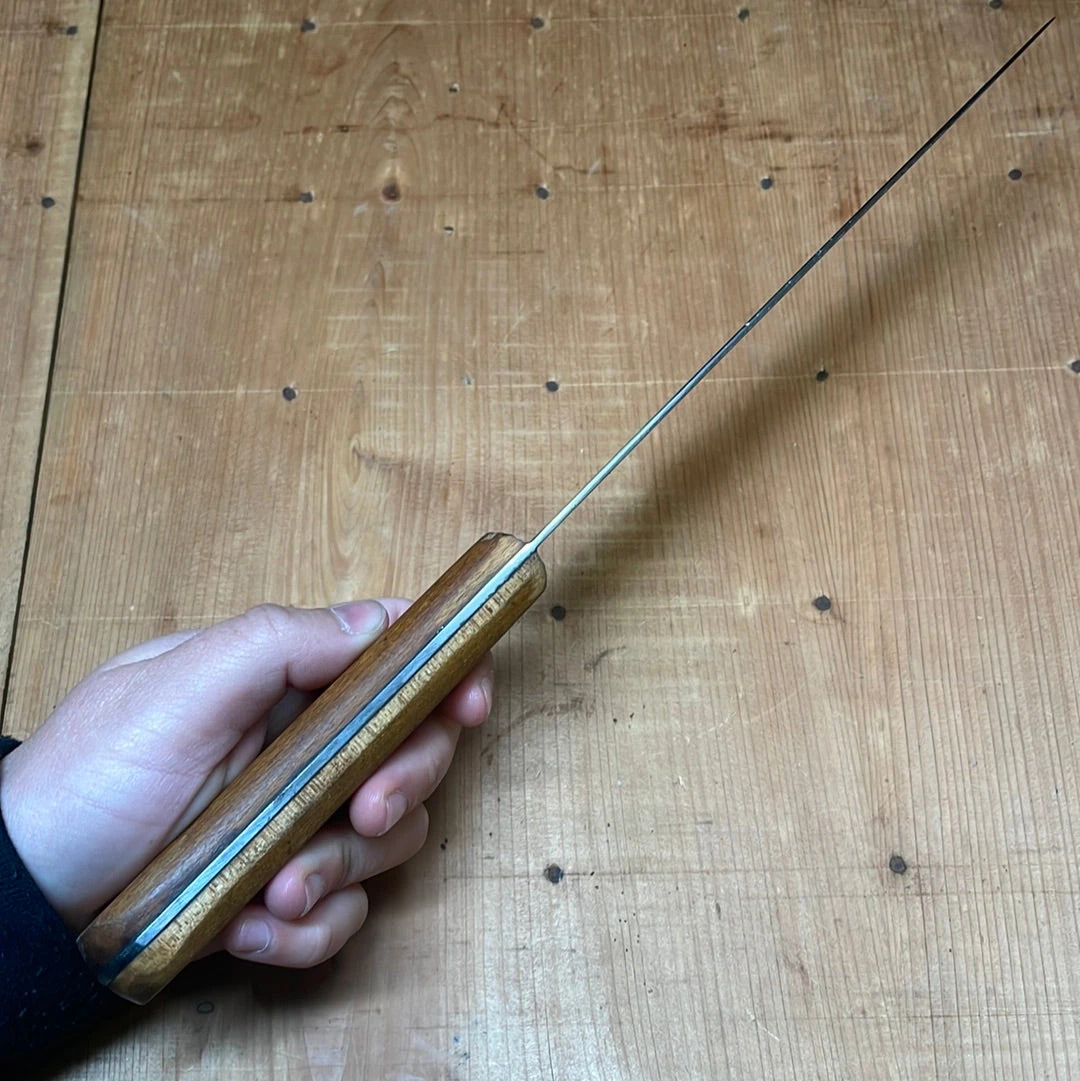 Vintage stamped (non-forged) carbon steel chef knife marks lost but certainly American and most likely LF&C from 1920’s to 1950’s probably on the earlier end with the steel rivets on this one. Carbon steel and beechwood are an old combination of materials used in the USA, UK and Europe and are great for working knives.