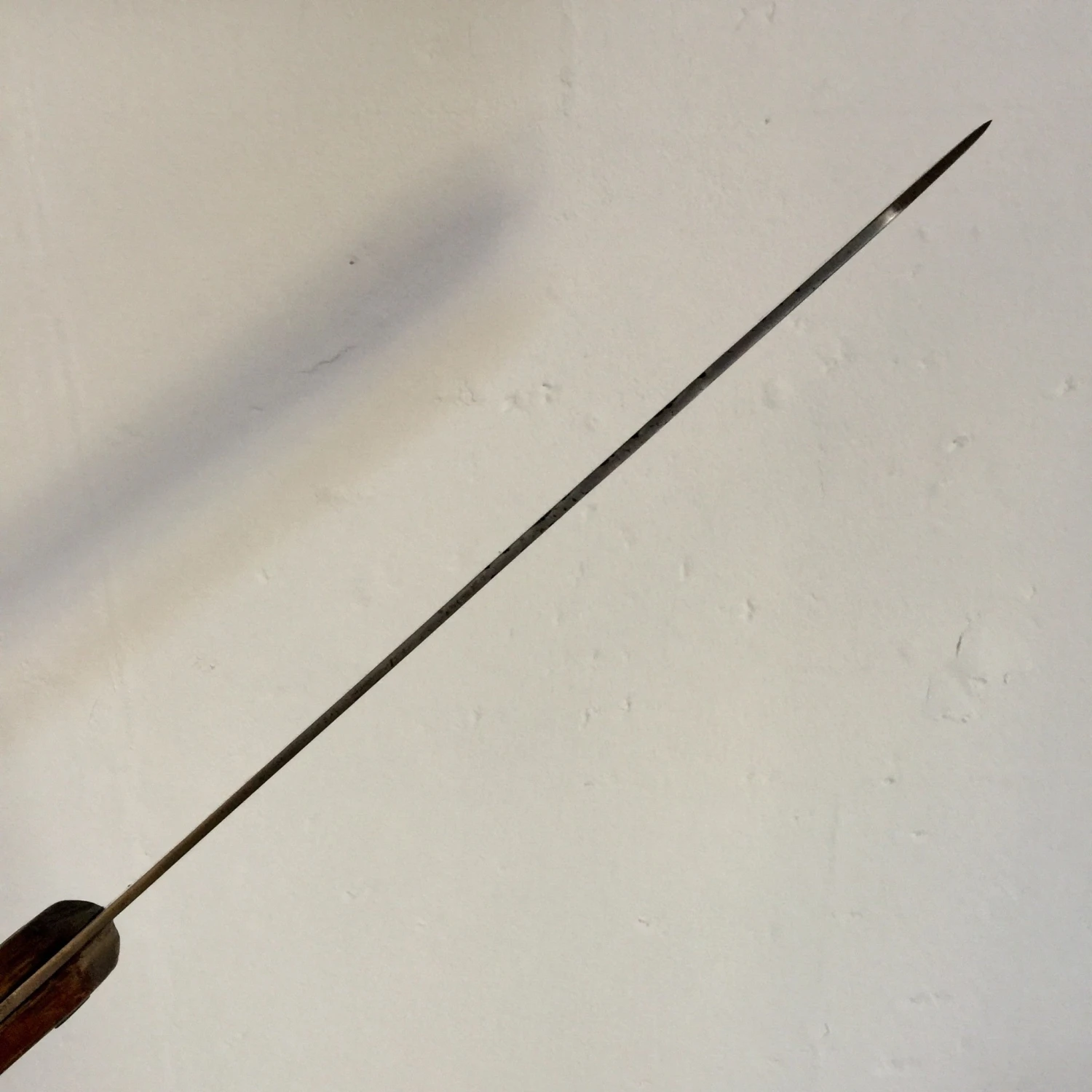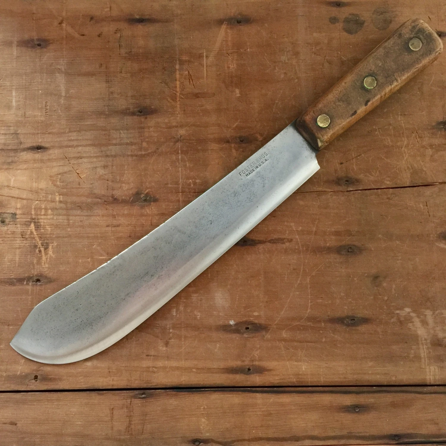 Vintage heavy bullnose butcher knife from Foster Bros with carbon steel blade, brass riveted hardwood handle with fresh convex edge.
