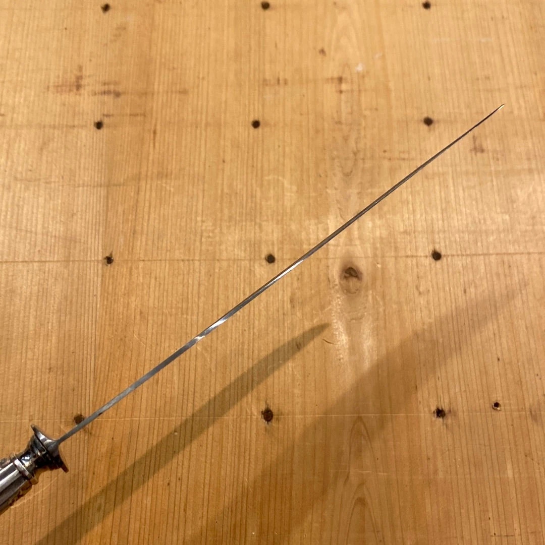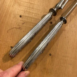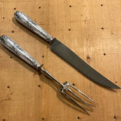 Knife has 7.5” blade and is 12.5” overall, carbon steel and silver, fork is 11” overall with plated carbon steel with silver handle.