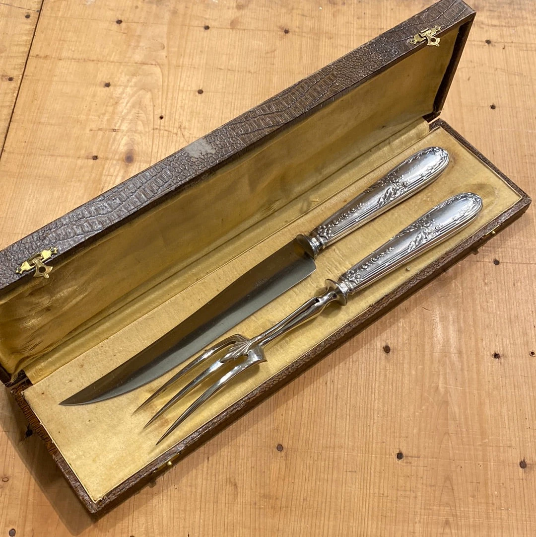 French boxed carving set marked Paris on blade and Acier Forge on fork. Handles have French silver assay marks but I cannot decider which degree of fineness they are for; 1 for .920, 2 for .840 or 3 for .750