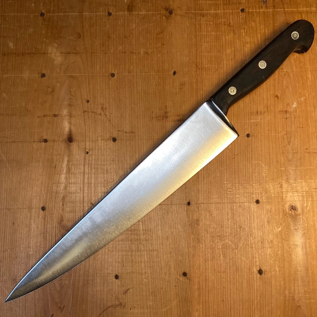 Drop forged and then hand forged (tapered tang, lots of taper in blade thickness) hand ground (and hand ground again) German chef knife from approximately the 1950’s (or early 60’s) judging from the forged tapered tang and pin and disc rivets but and very much still the norm then; solid wood handle scales. Hand forged and ground carbon steel knives like this largely ended in the mid 1960’s in Solingen Germany being supplanted first by the removal of hand forging after drop forging and later by stainless steel and less hand grinding. As the older skilled workers retired and the cost of labor rose hand grinding on carbon steel was no longer the norm in Solingen. Stainless steel became very popular and the bigger names in Solingen began to produce larger quantities of knives with less hand work in the 1970’s onward. This knife represents a previous era where hand work was a pillar of Solingen production.
