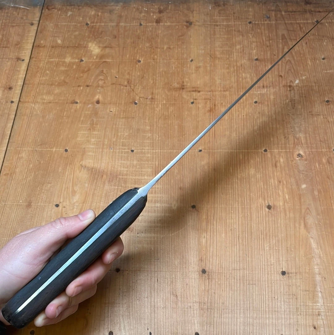This knife will work great for large ingredients like melons, large batches of veggies or as a slicer for boneless meat. Large chef knives like this were often used to prepare a roulade; a thin sheet of meat cut from a larger tougher section that was rolled up and trussed with different ingredients, there are old French or German recipies, see our book Sharp to see chef Chris Kronner’s take on this classic.