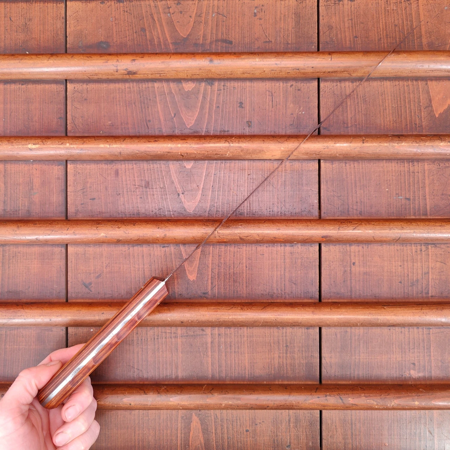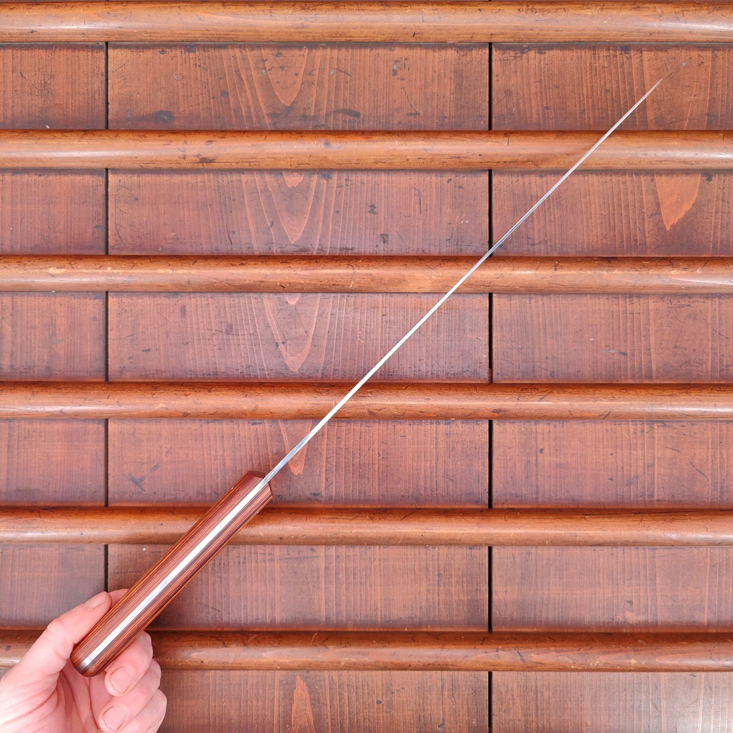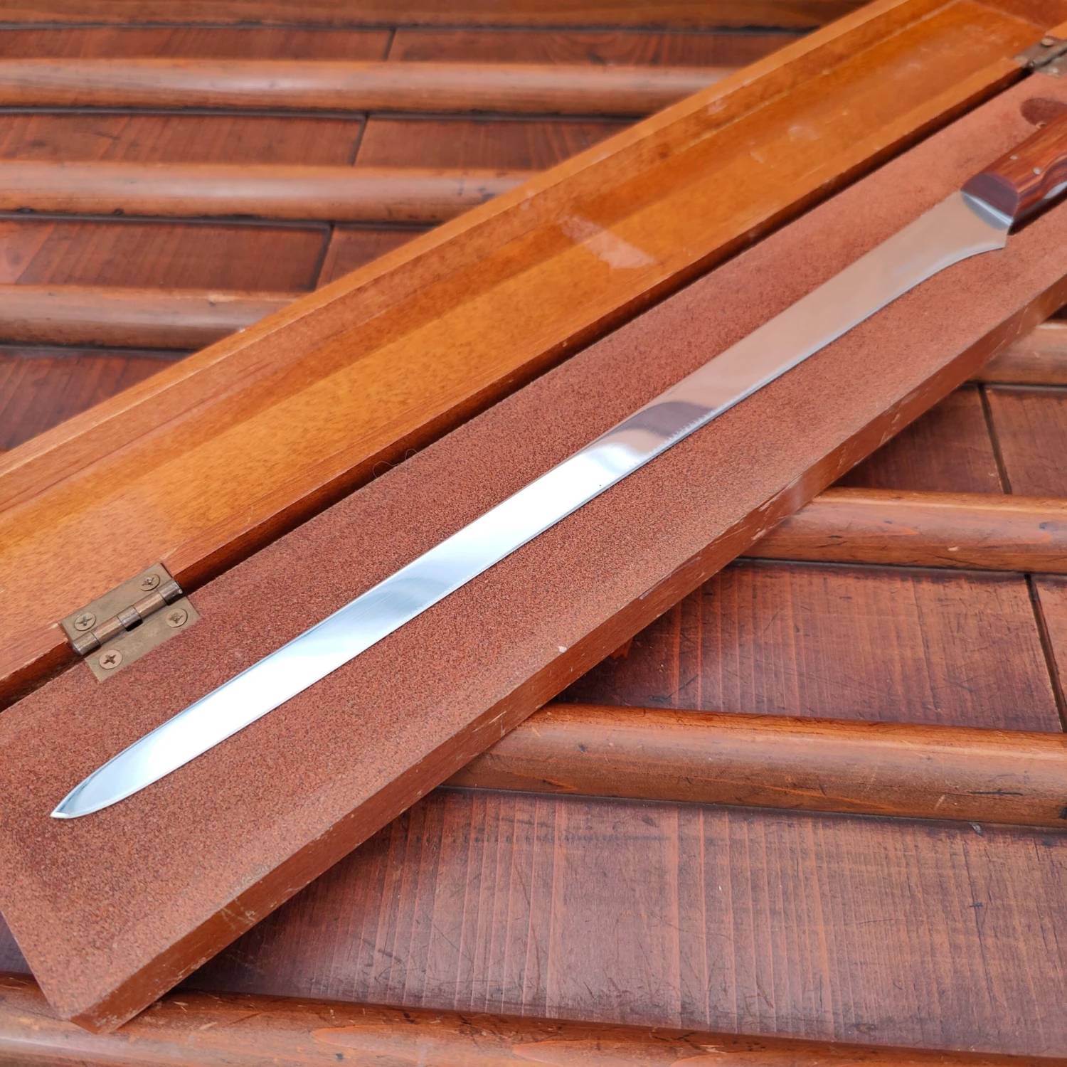 Chrome plated carbon steel with 5 pinned pakka wood handle and original box. Semi flex blade has all caps pre 1960’s KA-BAR logo suggesting late 40’s or 1950’s manufacture.
