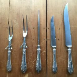 Excellent barely used condition late 19th early 20th C. LF&C Aetna works 5 pc carving set. 1886 patent date, Aetna works stamp was used between 1865-1960 but this set has all the features of a late 19th/early 20th set.