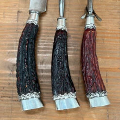 3 piece carving set made with carbon steel, sterling silver ferrules and stag grips. This set was made by Landers Frary at their Aetna works factory in New Britain Ct. At one point LF&C was one of the largest knife making outfits in the USA and was a huge kitchen equipment maker as well.