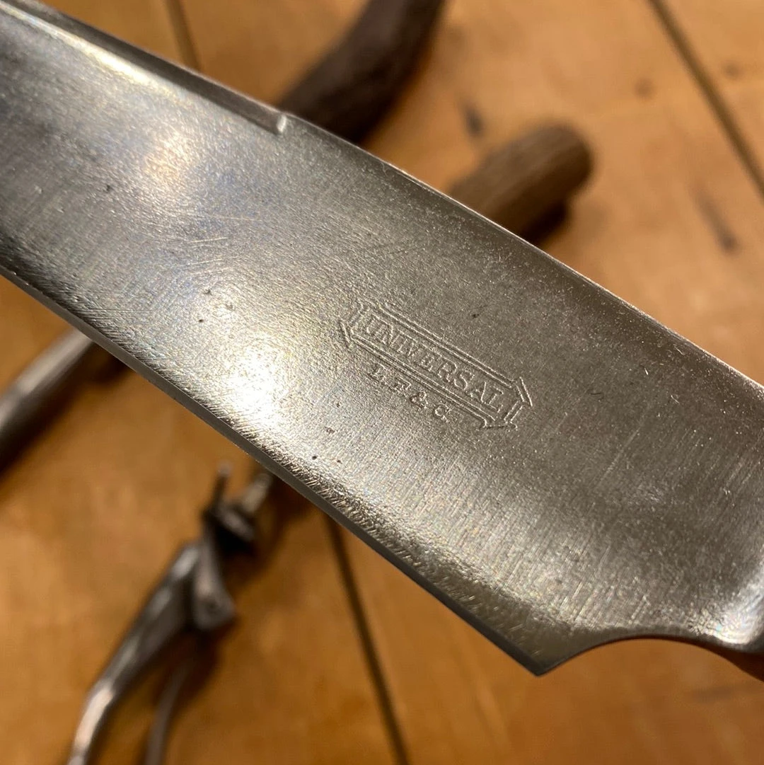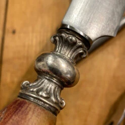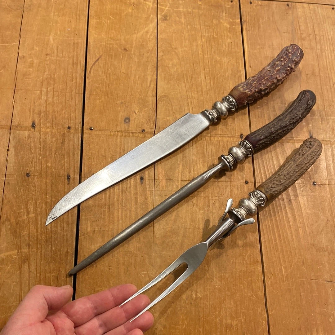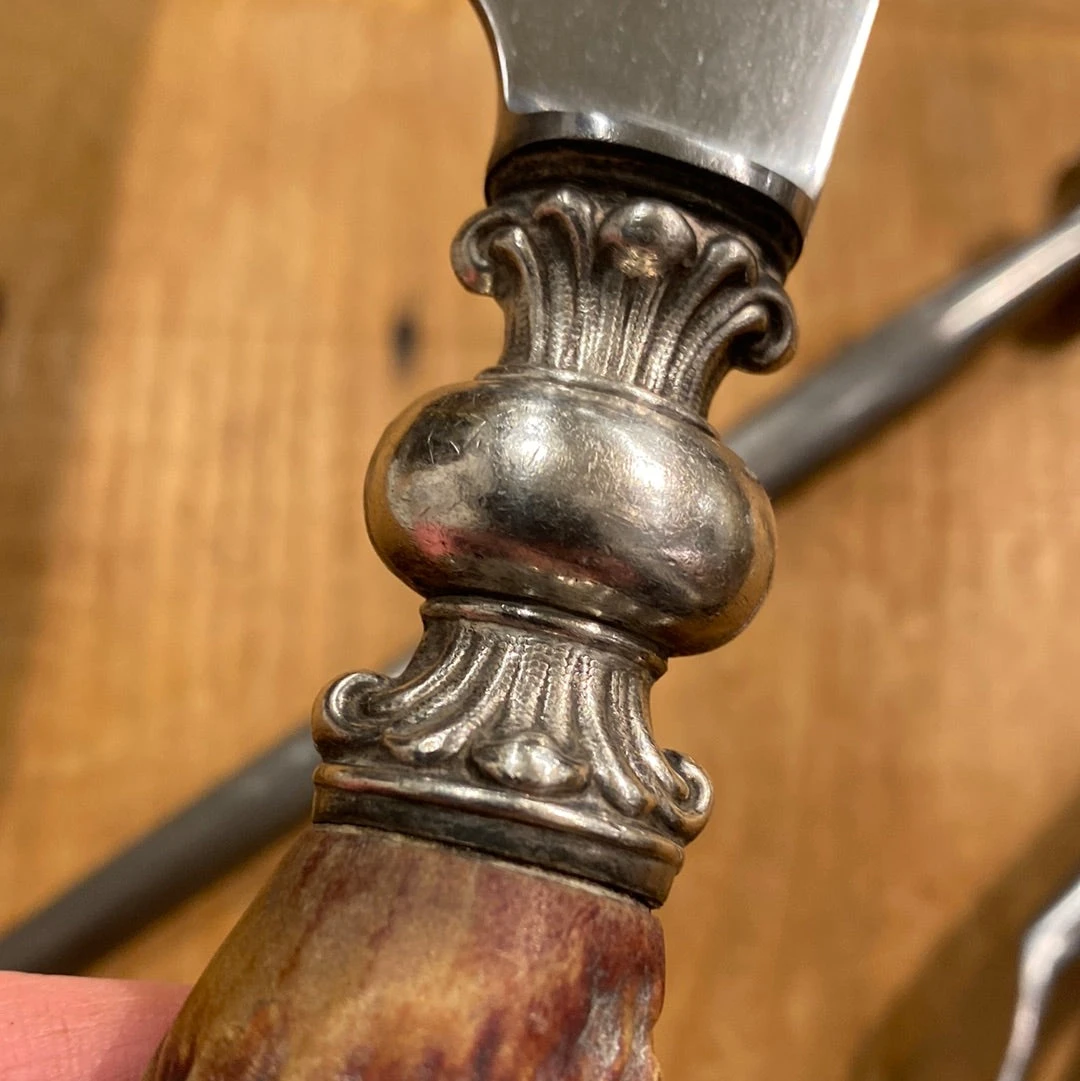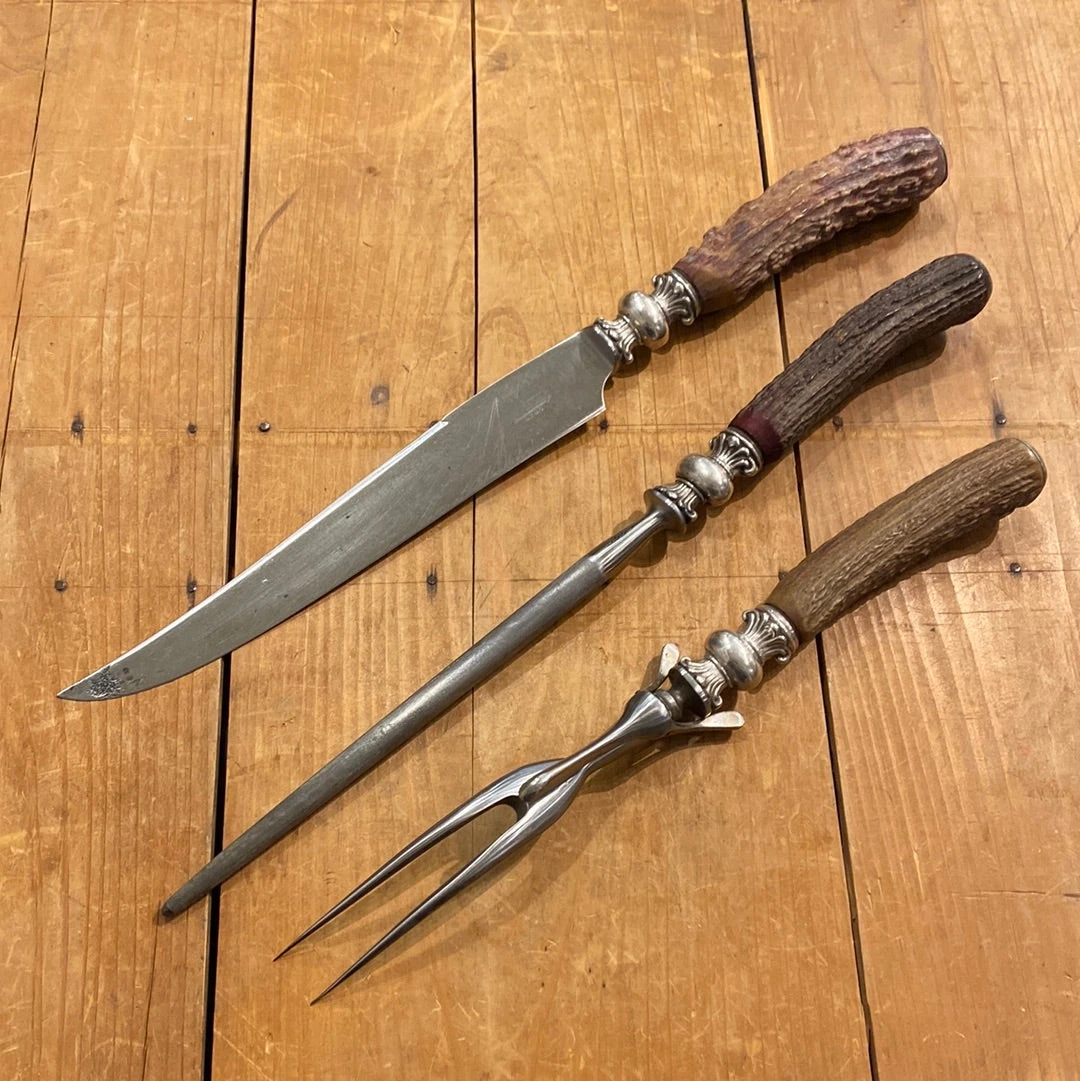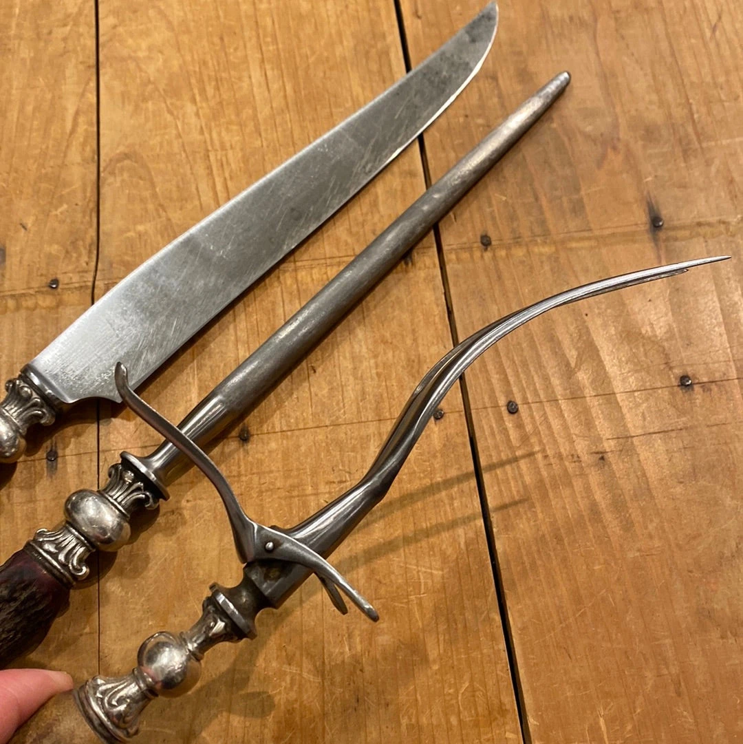 Antique Landers Frary & Clark Universal brand carving set; carbon steel, sterling silver ferrules and butt caps with stag grips.
