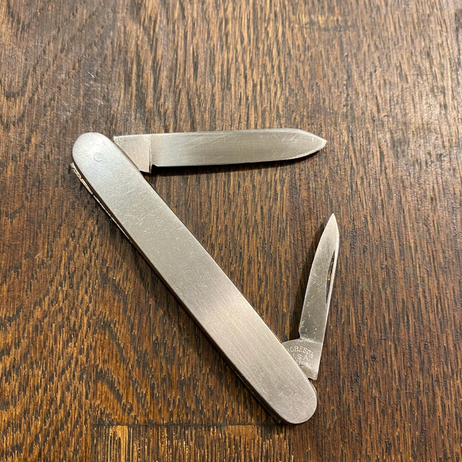 Robeson Shuredge 3” pen knife with stainless blades, nickel bolsters marked Delhi. The range of production of knives marked Robeson Shuredge is from 1922 to 1977. An identical knife with a different promotional company logo dated this make to 1938 at the latest, this might also be from that same time or a little later.