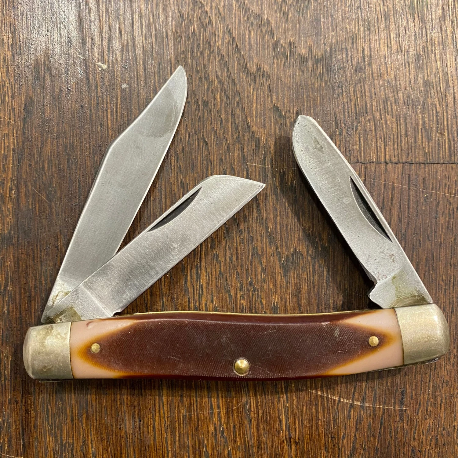 Carbon steel blades, brass liners, nickel bolsters and ‘delrin’ composite scales. Blades have been sharpened in some but are still nice and snappy with no wiggles. A good user here although many collect this era Schrade as well.