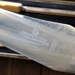 Stainless steel was not an immediate success as early versions didn’t perform very well. Supposedly Brearley was also credited for inventing a knife that would not cut… Brearley left the Brown-Firth Research Laboratory in Sheffield in the 1920’s and this set likely dates from around that time.
