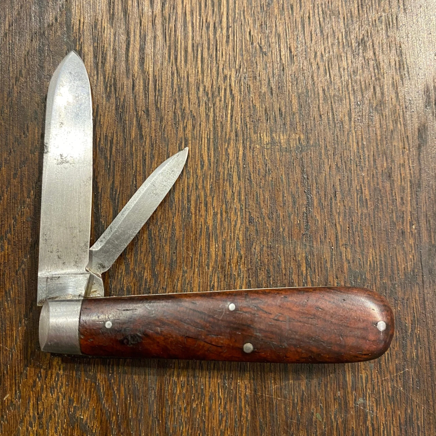Carbon steel blades, iron liners and bolsters and rosewood hafts. The nail nick for the main blade is a little hard to get to and has been re-tipped as about 1/16” of it was broken off when found. Blades are very full otherwise and mechanically excellent.