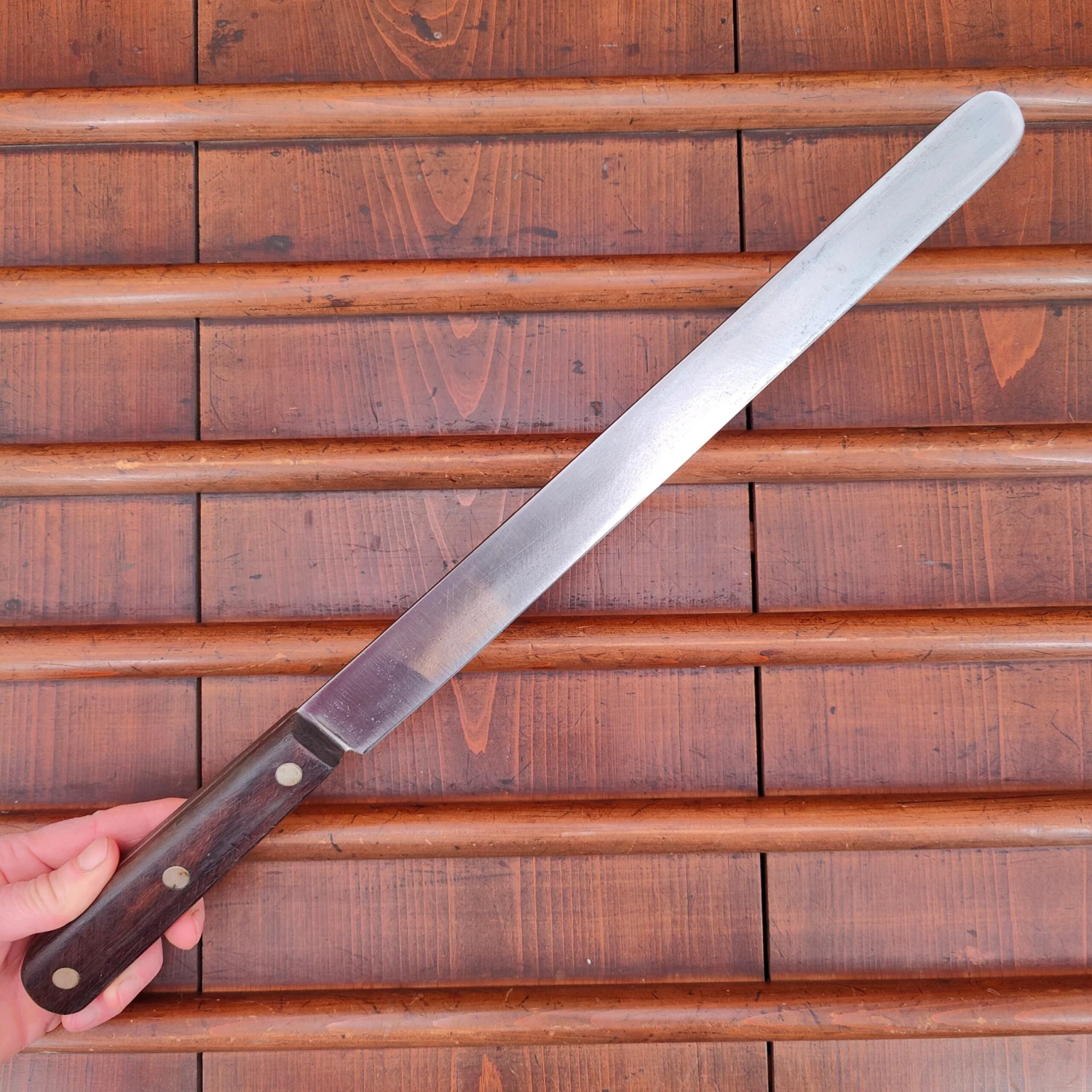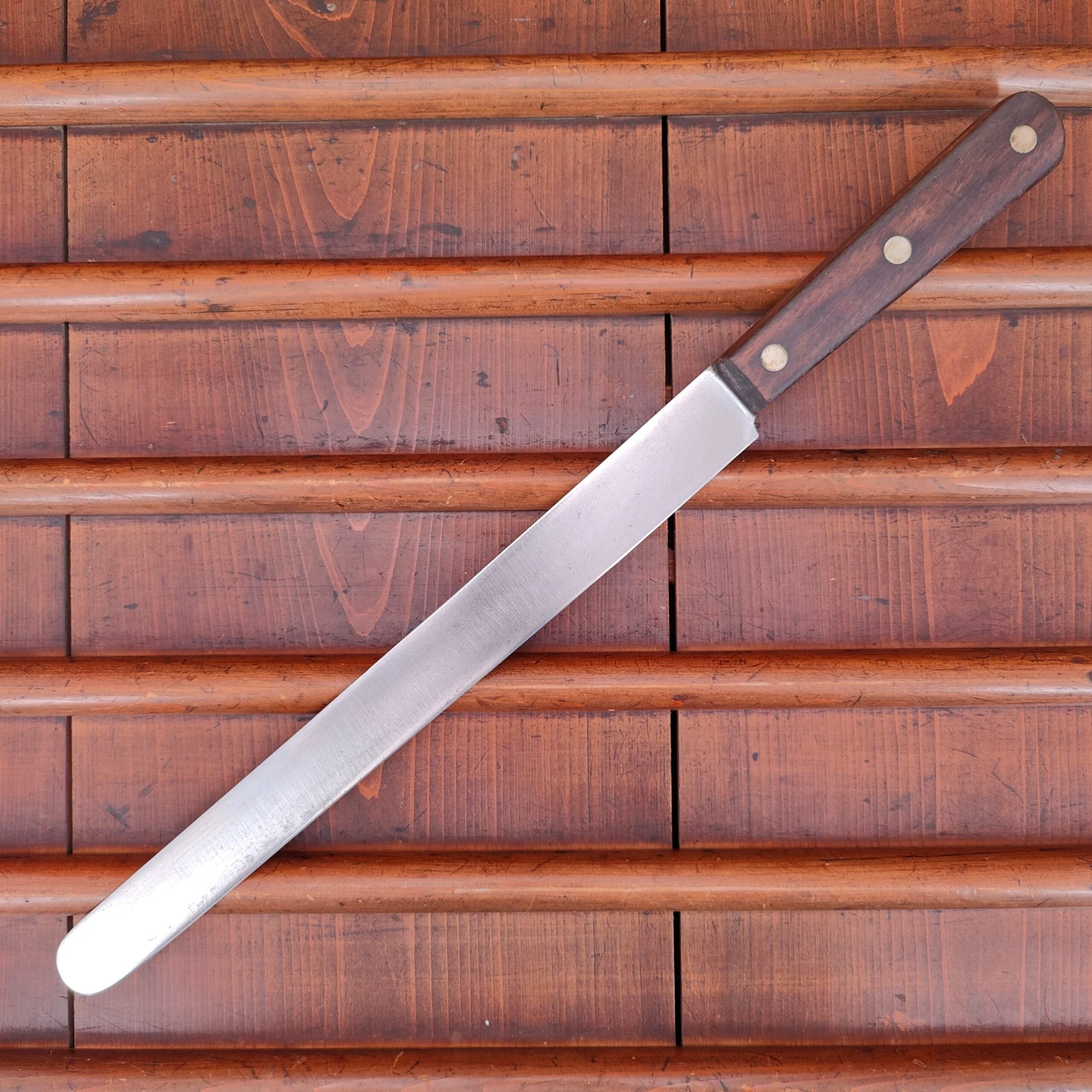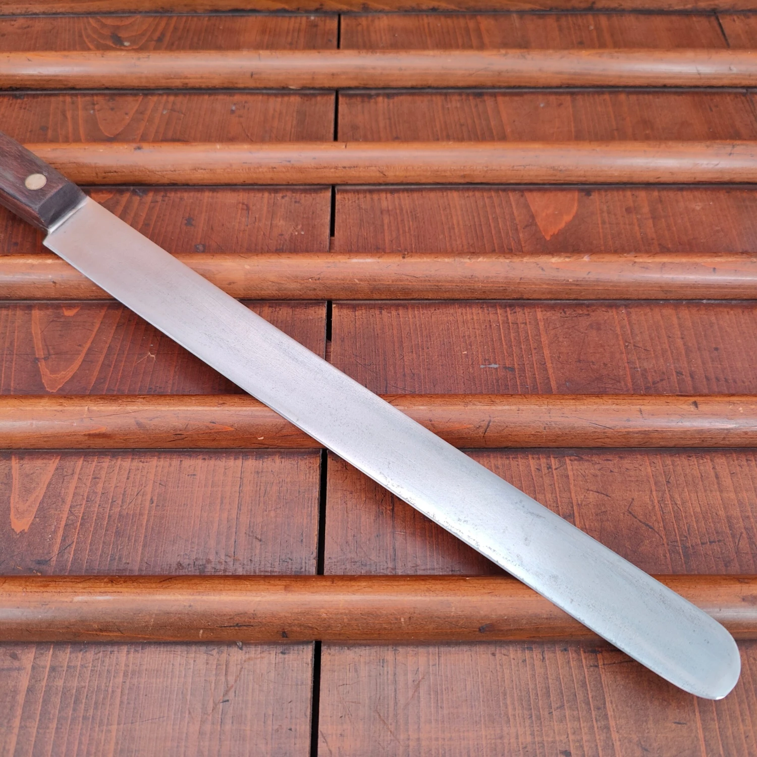 Unmarked but certainly American round tip slicer with carbon steel blade and rosewood handle from approx the 1930’s to 60’s.